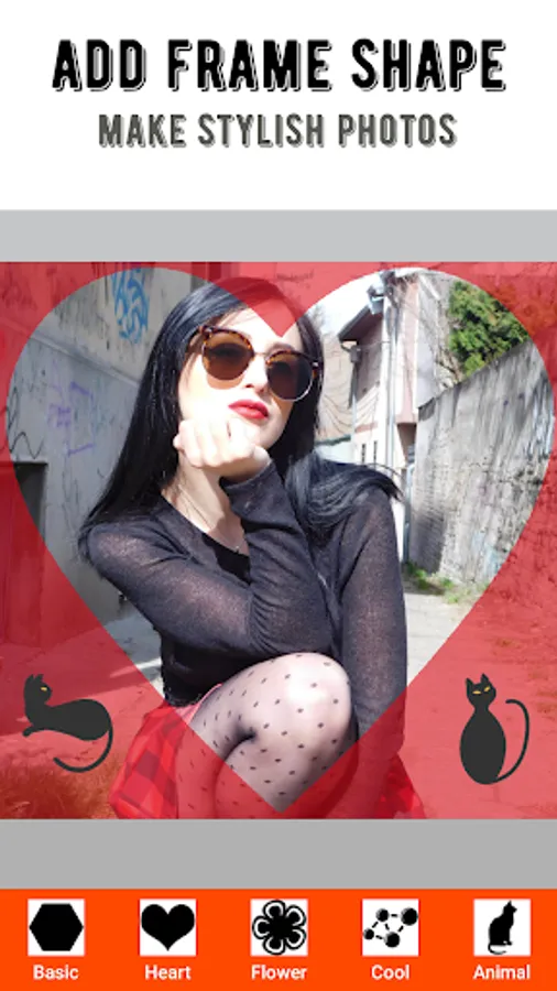 - Choose a picture you wish and add shape over it, like a transparent frame. You can use heart, flower, circle, star… Change the color or use a pattern. Also you can add some of cool stickers.→