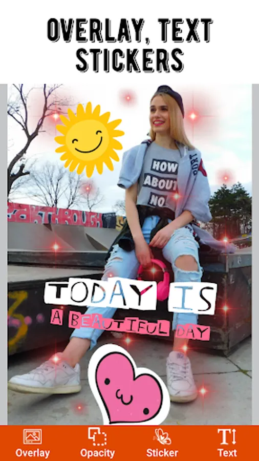 - Select an option overlay and add some of overlays to cover your picture, like stars, hearts or fire. Change it’s opacity so that effect looks nice.→