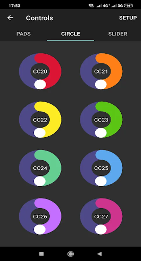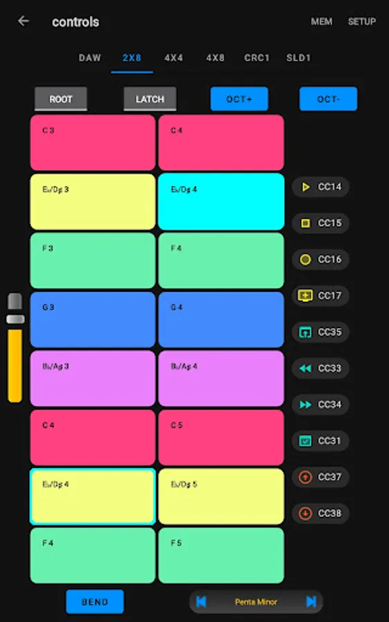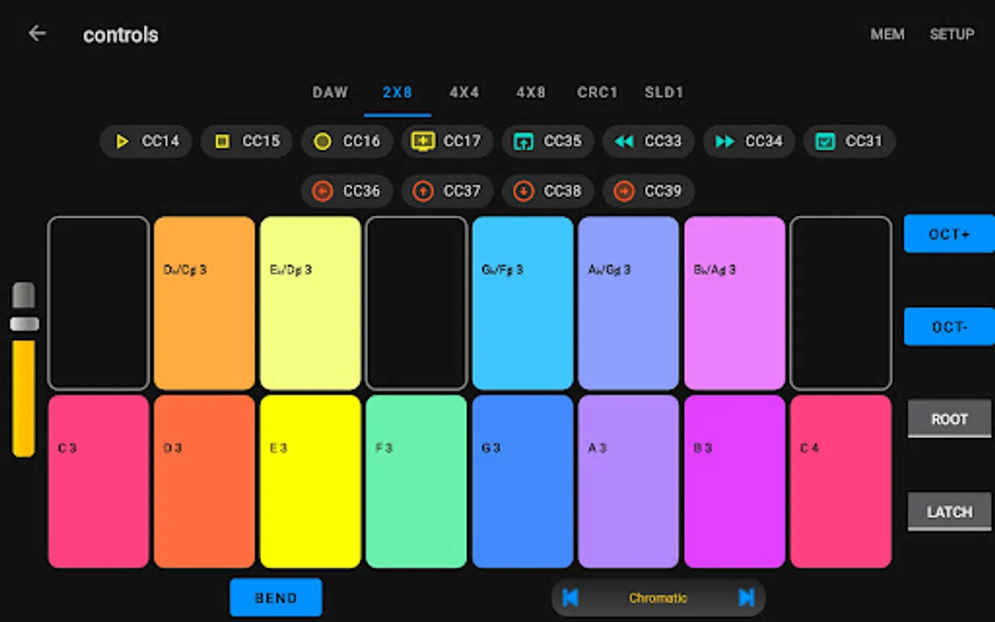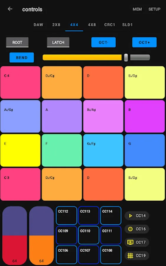 WiMidi allow additional control with a 4*4 and a 4*8 pads note and 16 scales input and CC input : 2 XY controls, 9 buttons,12 sliders, 8 circle knobs, with predefined Midi-CC sets and each CC group customizable