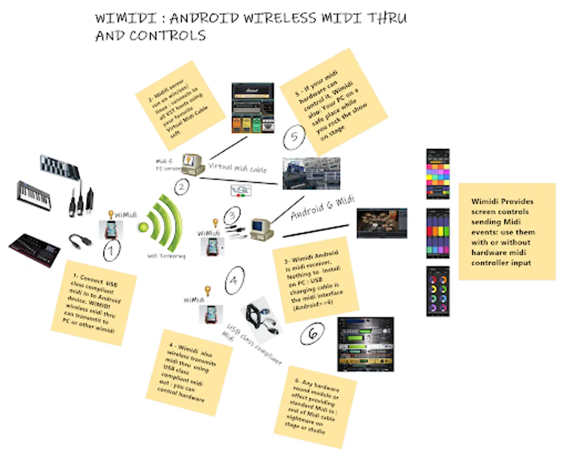 * WiMidi network Input, you don't need a PC with wifi to control all your sounds wireless : Using 2 WiMidi instances with 2 android devices is a perfect solution = You are free from midi cables and your PC cpu power is not used for wifi (also prevent firewall setup issues)
