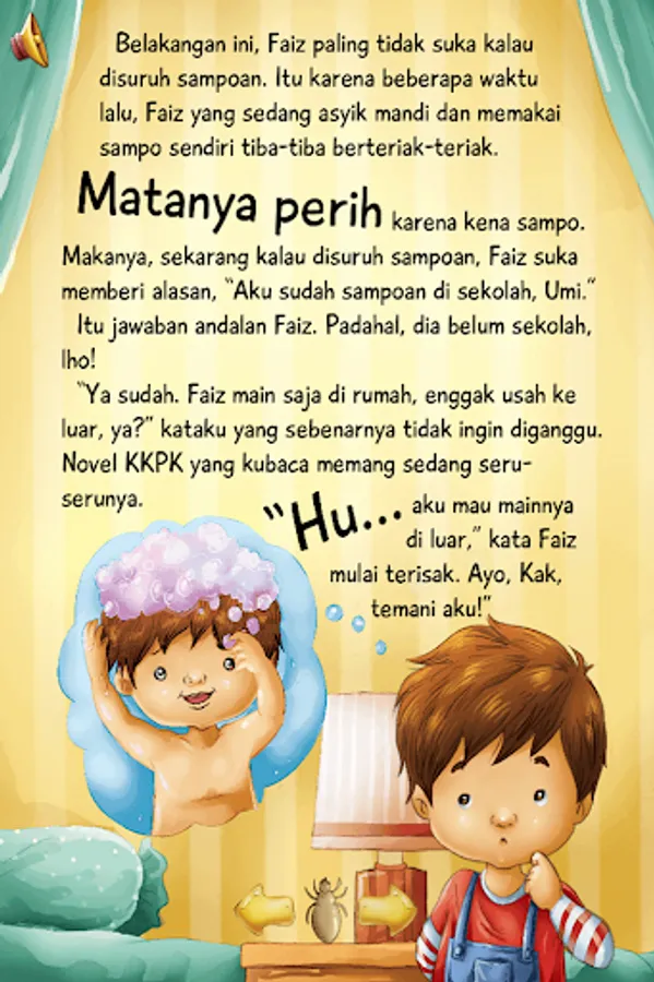 Faiz is very fond of cartoon characters. However, he does not like being told to shampoo. This is because some time ago, his eyes got foam shampoo when bathing. Faiz's eyes feel very sore. So, until now he did not want to be told to shampoo. One day, Abi, Ummi, Sarah, and Faiz went to the zoo. At the zoo, Faiz kept scratching his head. Sister Sarah became suspicious. What is in Faiz's head? Why does he always scratch his head? Follow the full story in the following application.