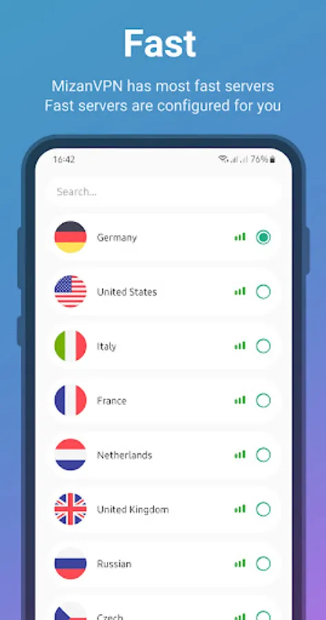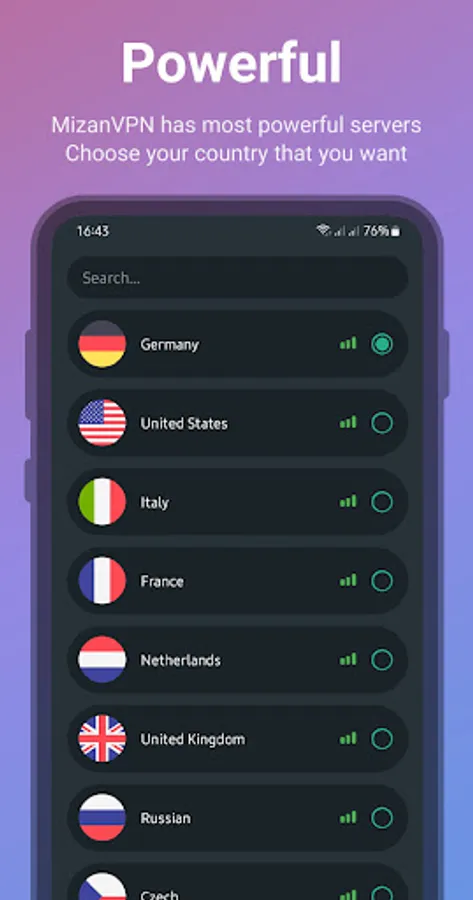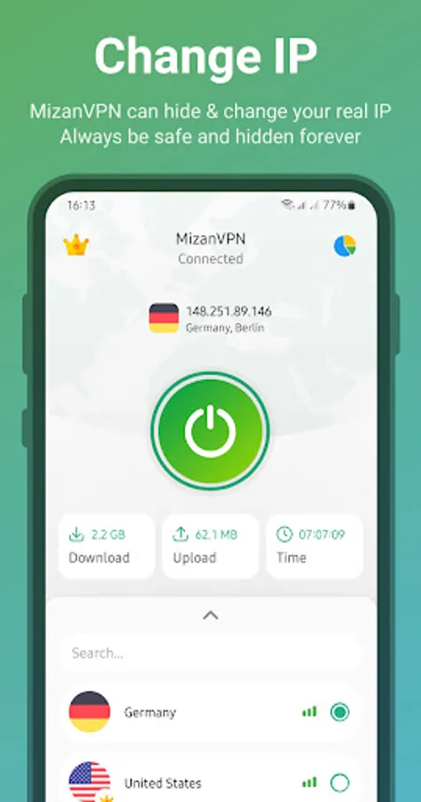 Mizan VPN is a fast, free and unlimited VPN proxy, offering you a fast VPN connection and stable VPN servers. This application can change your IP and DNS for a safer and faster internet. If you can not open some sites Mizan VPN can do that for you. Using this application is very easy. Just press big button to connect fast and safe internet. Also you can see your traffic on charts. How much you Download or Upload ? This app can show your download or upload speed or size on charts. If you want to open a site with another country you are not there, just use Mizan VPN. Change your IP and your DNS and be hide forever. You can access the Internet securely and anonymously. Mizan VPN means Anonymous and secure internet, Freedom to browse any sites, Stream anything you want, Military-grade encryption. There are so many country for you in MizanVPN and you can choose them.
