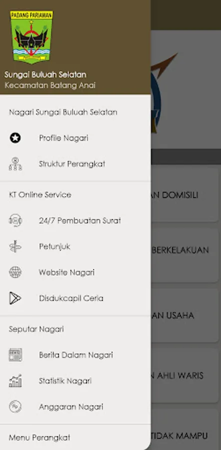 Aplikasi Mobile Warga Sungai Buluah Selatan ,Kec. Batang Anai, Kab. Padang Pariaman, hadir untuk mempermudah komunikasi Warga dengan Perangkat Nagari. Kualitas Pelayanan Digital di antaranya memiliki fitur: