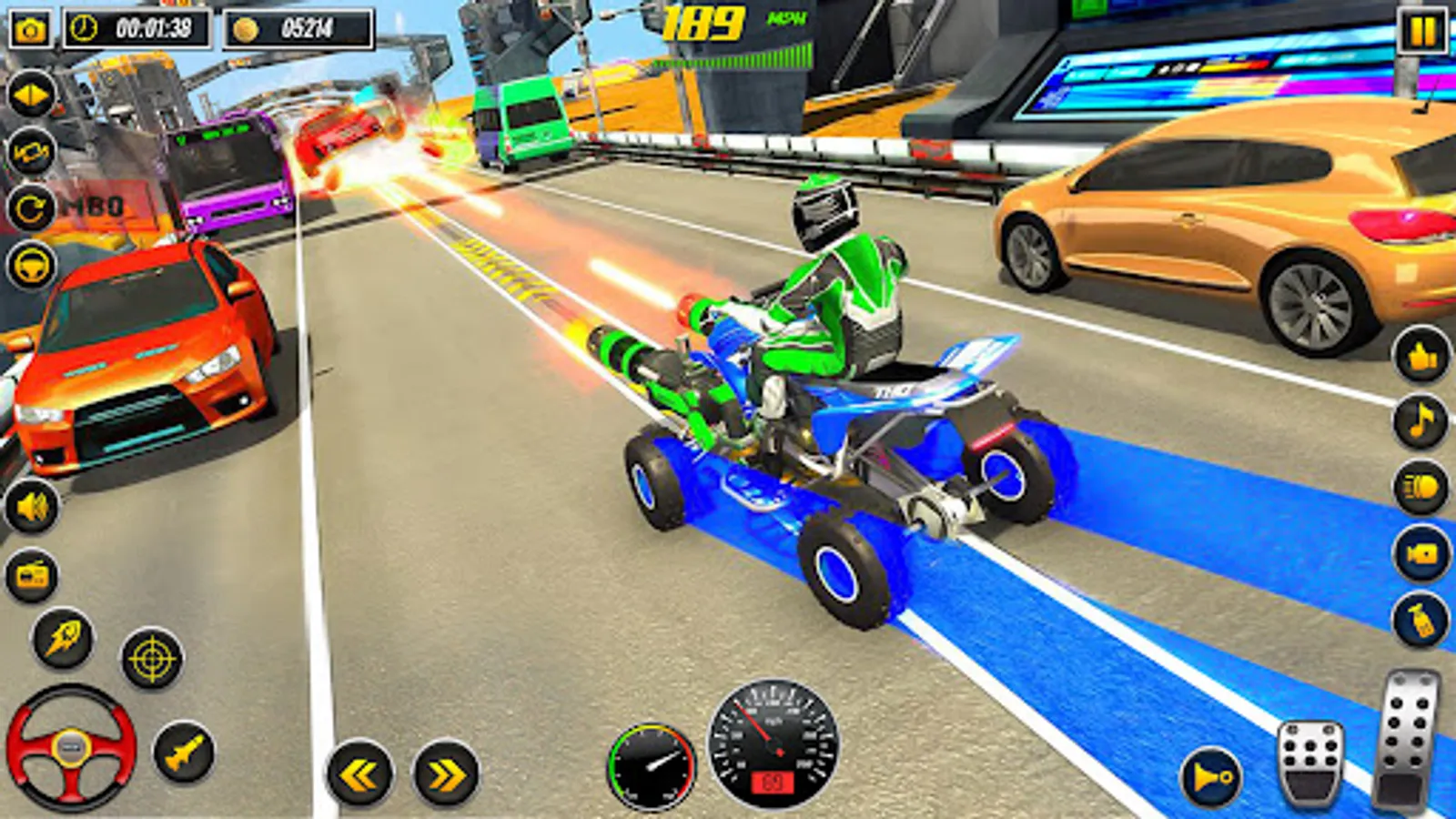 This bike shooting game ensures to fulfill the ultimate traffic shooting extreme atv games in real quad games. Quad bike racing simulator will give you a taste of extreme city bike driving games and bike racing that offers no less than the real fun of atv kart racing games, real quad games & quad bike games. Get the all terrains highway racing vehicles and take part in the impossible challenge of quad bike driving games and moto racing games. Become the pro traffic shooter as you embark on the endless bike shooting journey on multiple environments including coast line, desert highway and sci-fi tunnels. This real bike racing simulator comprises features of bike shooting games & highway traffic shooting games. Play as pro traffic racer while driving your nitro boosted fastest quadbikes and get the extreme bike shooting expertise.