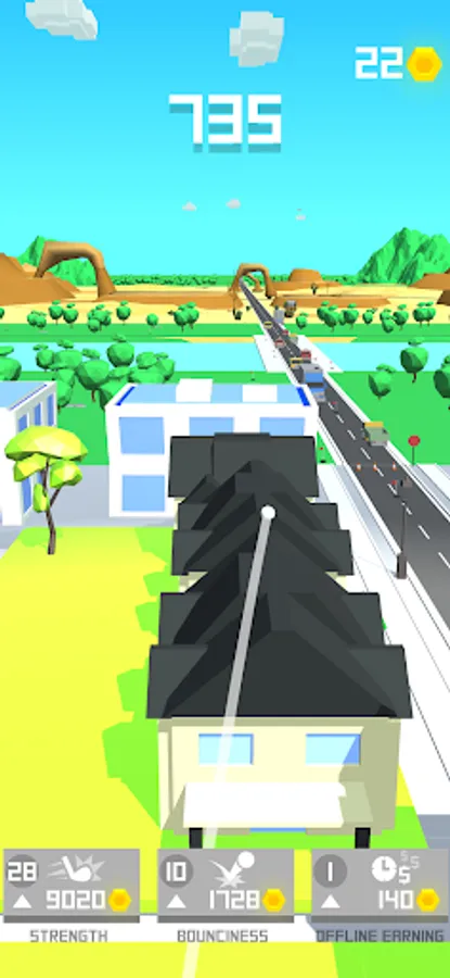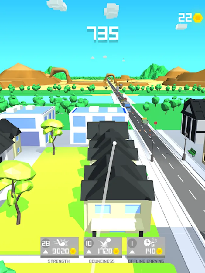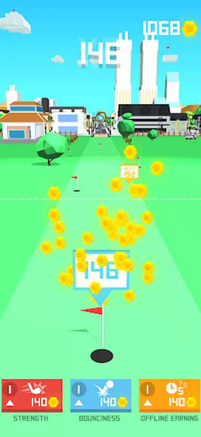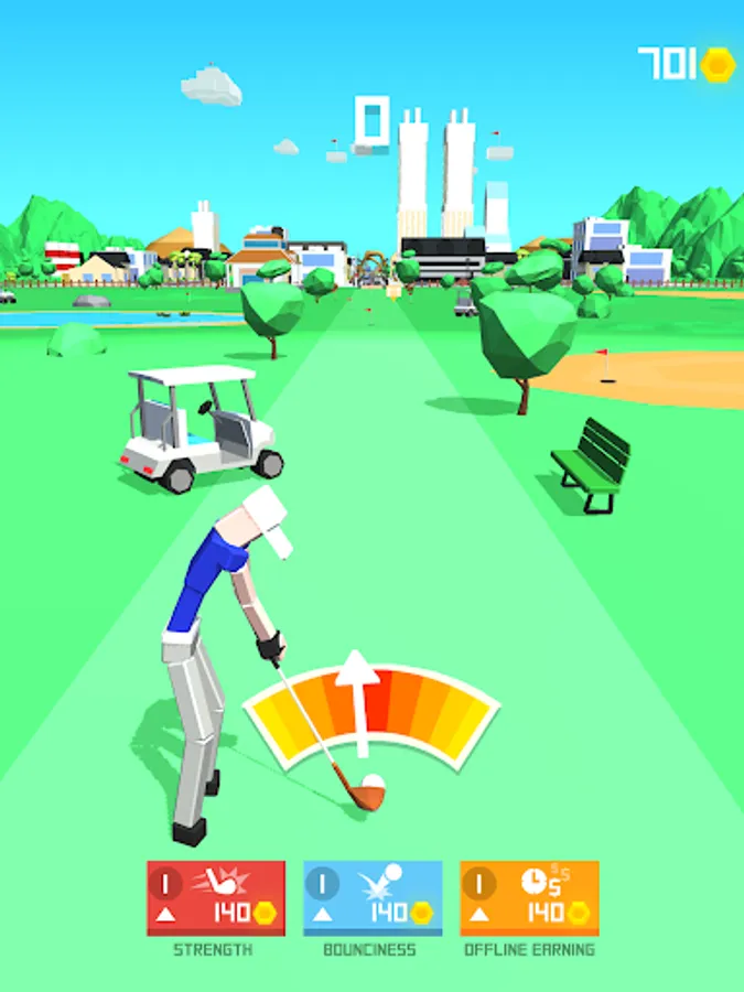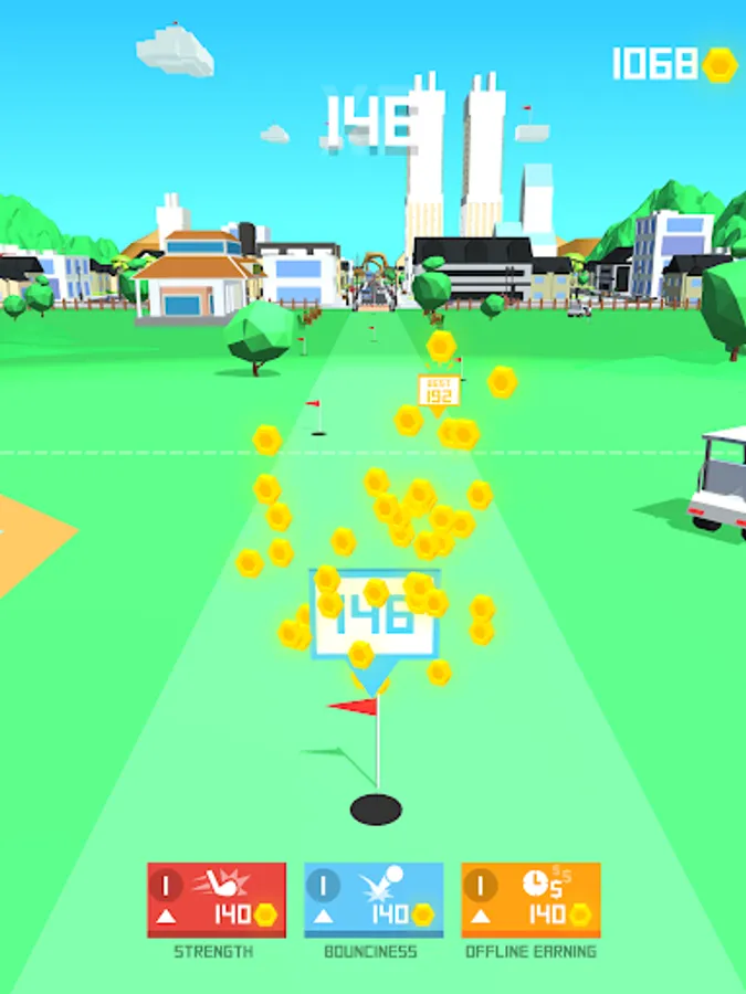 Swing as hard as you can and upgrade your stats! Improve your best distance and try to reach far-off holes !
