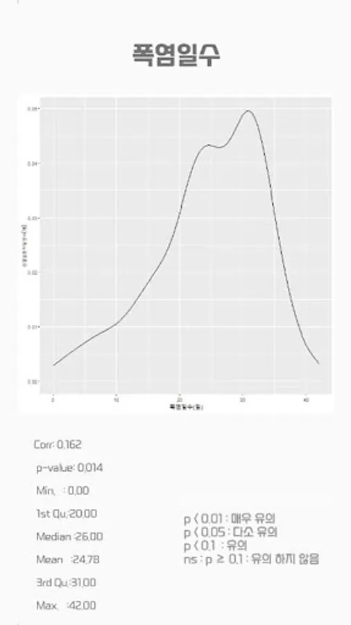 Analysis of heat waves damage factors and heat patients (probability distribution density graph, Corr, P-value, Min, 1st Qu, Median, Mean, 3rd Qu, Max ) for each factor (number of heatwave days, tropical night days, maximum daily temperature, day Minimum temperature, daily average humidity, heat index, black bulb temperature, perceived temperature, number of health insurance subscribers_workplace, number of health insurance subscribers_region, drinking rate, proportion of elderly living alone, number of people with activity restrictions, proportion of elderly population, number of infants and children, urbanization rate, Information is provided according to per capita green area ratio, number of medical institutions, number of aged houses, financial independence, number of people with nervous system disease, number of people with respiratory system disease, number of people with circulatory system disease, number of people with digestive system disease (regions are largely urban, non-urban and nationwide) provided in units)