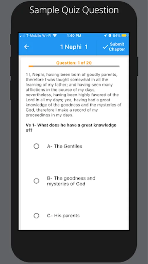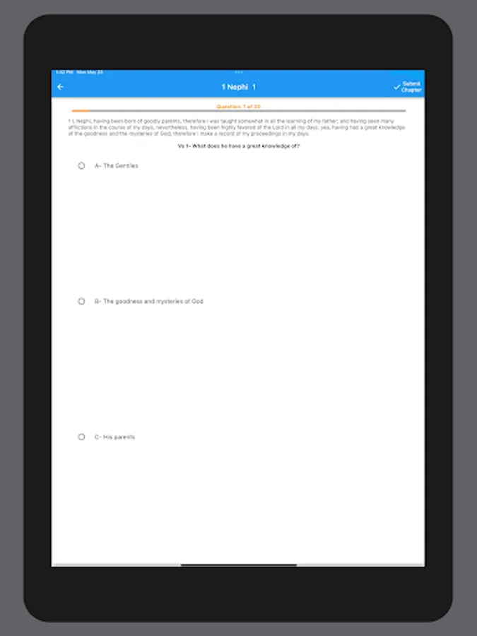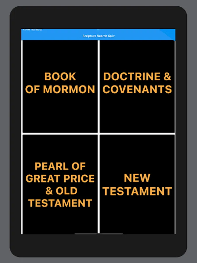 Scripture Search Quiz is an app that will guide users through the Book of Mormon, Doctrine and Covenants, and Pearl of Great Price using search questions for every verse. This app will help users deepen understanding as they search for principles and key ideas. Scripture Search Quiz is designed to not only guide children and new readers of the scriptures but to also deepen learning and application for experienced readers. This app is not licensed by or a product of The Church of Jesus Christ of Latter-day Saints, and these search questions represent the views and perspectives of the creators of the app and not those of The Church.