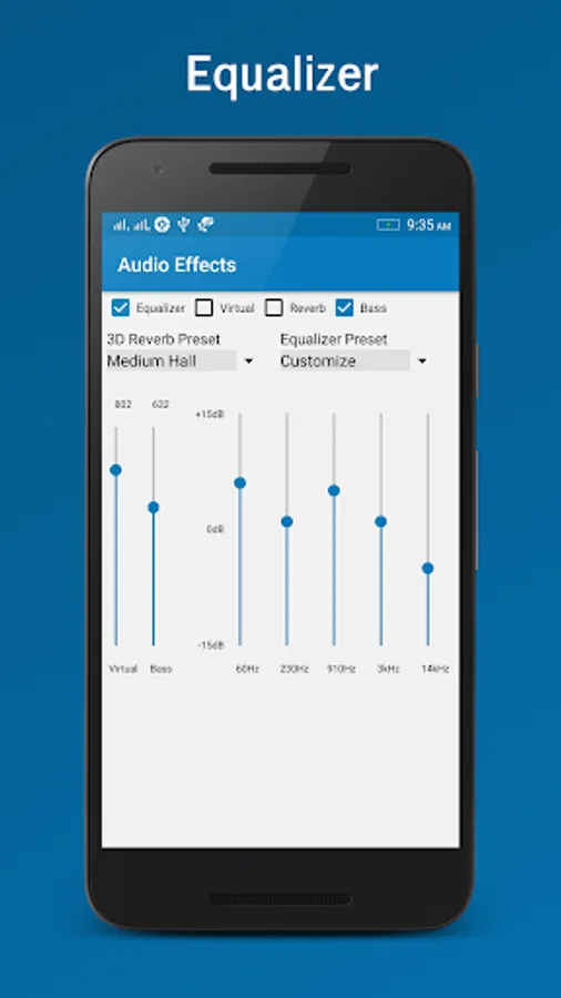 ✔ 5 Band Equalizer with Bass Boost, 3D Reverb Effects, Virtualizer & 10 amazing presets.