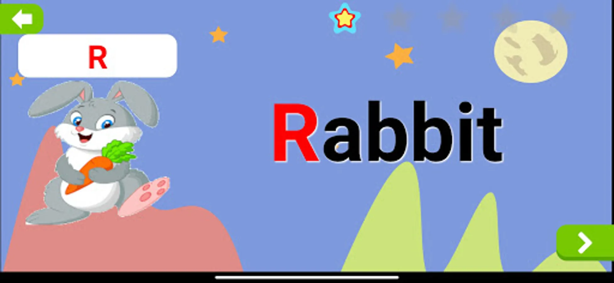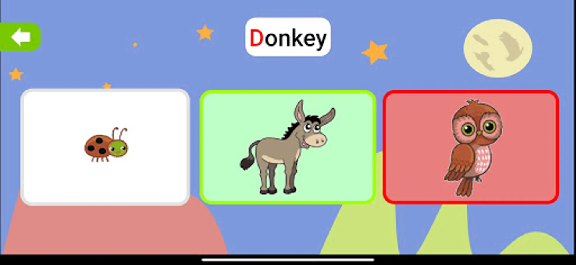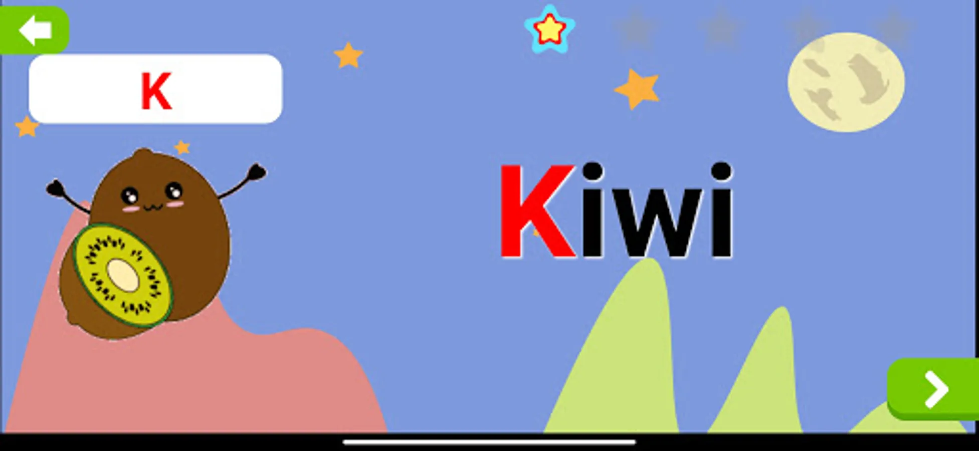our app will achieve its purpose of getting the kids meet their potential in learning purposely and pleasurably. The way of us achieving that, will be the results of limitless planning and surveying that resulted in a finding that revolutionized learning. We found that kids in early ages can find it hard to learn new words, but the simple way to get them to learn those new words are using flash cards, games and songs. Flash cards, games and songs leave huge impact on them, because kid's brains get attached to colorful images and songs. That's the whole reason why our lessons are constructed this way, each letter's lesson include a word starting with the letter, picture of the word's meaning and musical phonetics on how to pronounce it, in a flash card. It also includes the sound of animal's and fruit's names. Then the kid advances after each letter or name to a game for releasing the stress and keeping the attention of kids engaged in learning. Games are a fun way to keep kids interested in learning without getting bored, our games can be used to test the kid's understanding. We also have a section that is called "Play & Learn" which teaches kids how to draw the letters(Draw Letters), Learn counting(How Many Ducks), differentiate between the numbers easily(Find numbers), differentiate between the letters(Balloon Game), spell words(Write Blanks), identify the animals, fruits and vegetable (Find Picture). We also try to expand their learning experience by getting them to start learning and loving other languages as Arabic, English and Spanish.