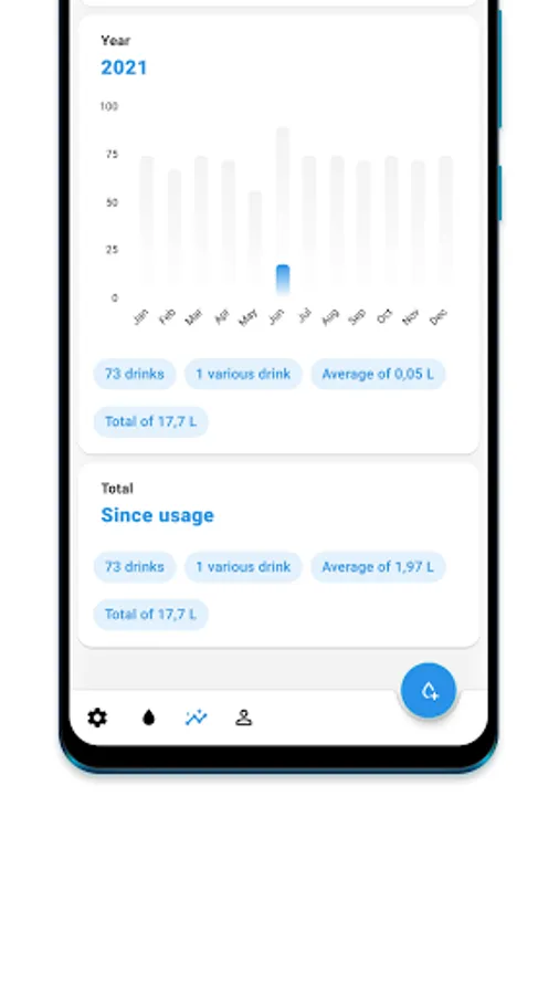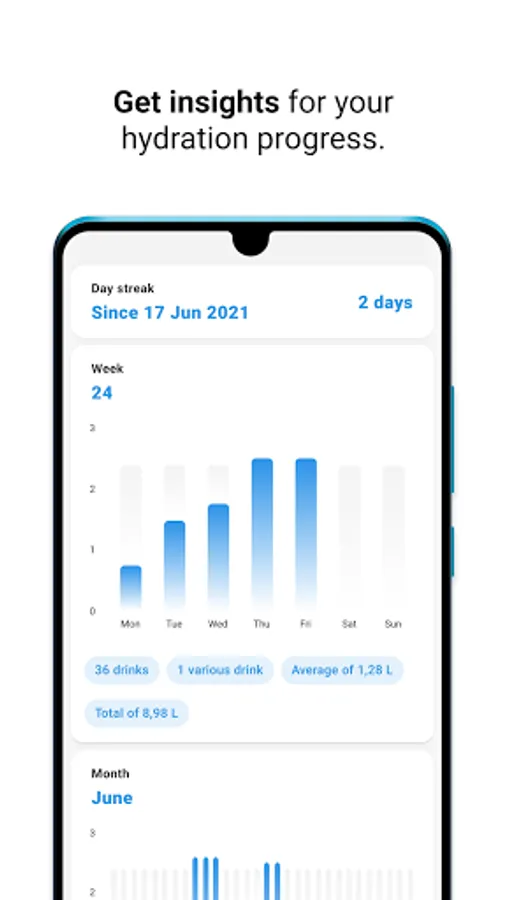 View stunning charts by week, month, year, or total. See which drinks you drank the most and make sure to keep your hydration day streak going!