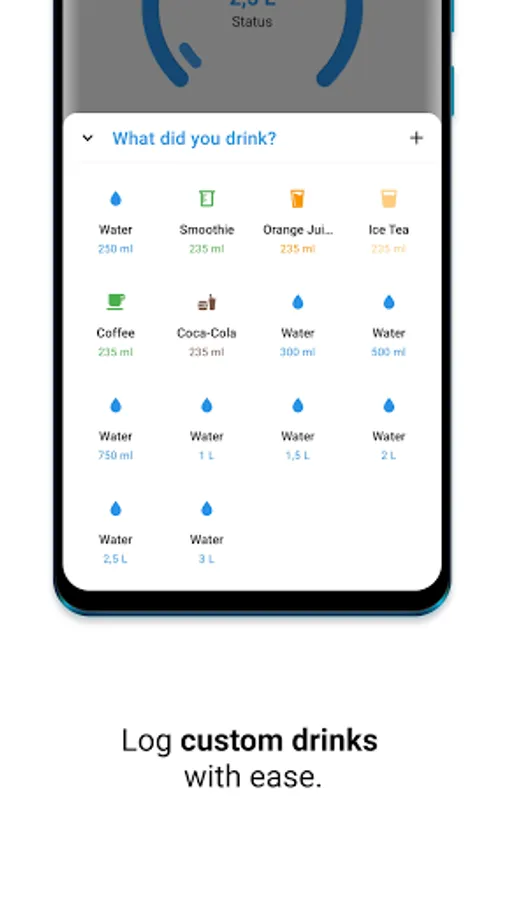 Set up your regular drinks and enrich them with a unique icon, color, and label. Specify the temperature of the drink, as well as the hydration factor.