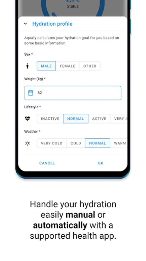 Aquafy is able to check the weather at your location and your sport activity with the help of supported health services and automatically adjust your hydration goal.