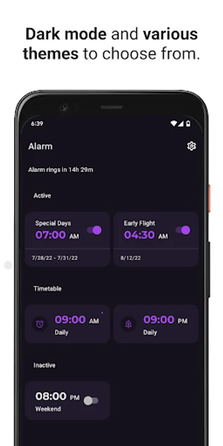 Alarms support a wide range of challenges that can make sure you get up and have a healthy start into your day. Challenges can affect your environment, motivate you to certain actions, or require you to win small mental mini-games.