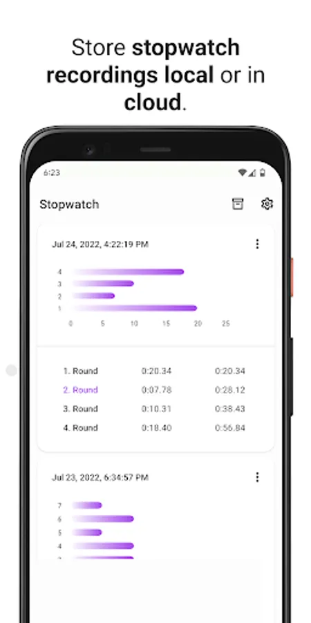 Important stopwatch recordings can be saved on your device or in the cloud.