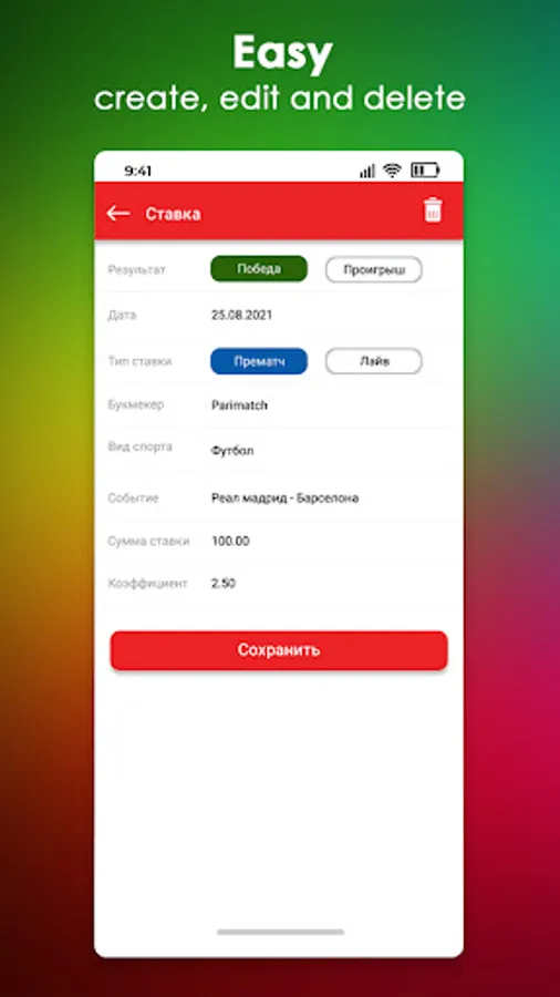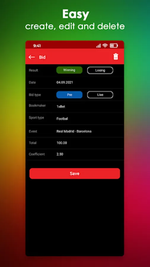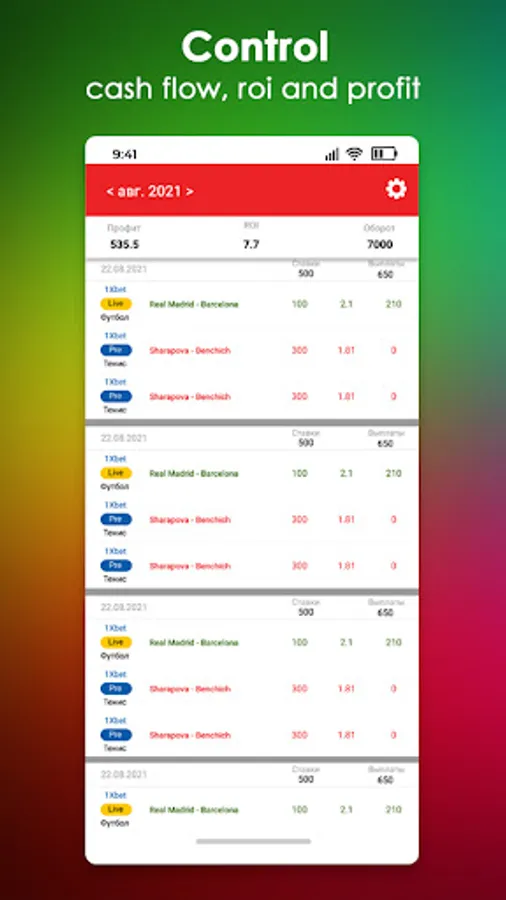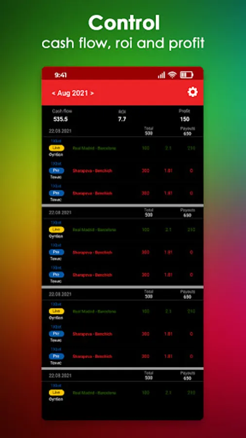 Betting money manager application will help control your money. The application show you your cash flow, roi and bookmaker payouts. This is a must-have app for anyone placing bets.
