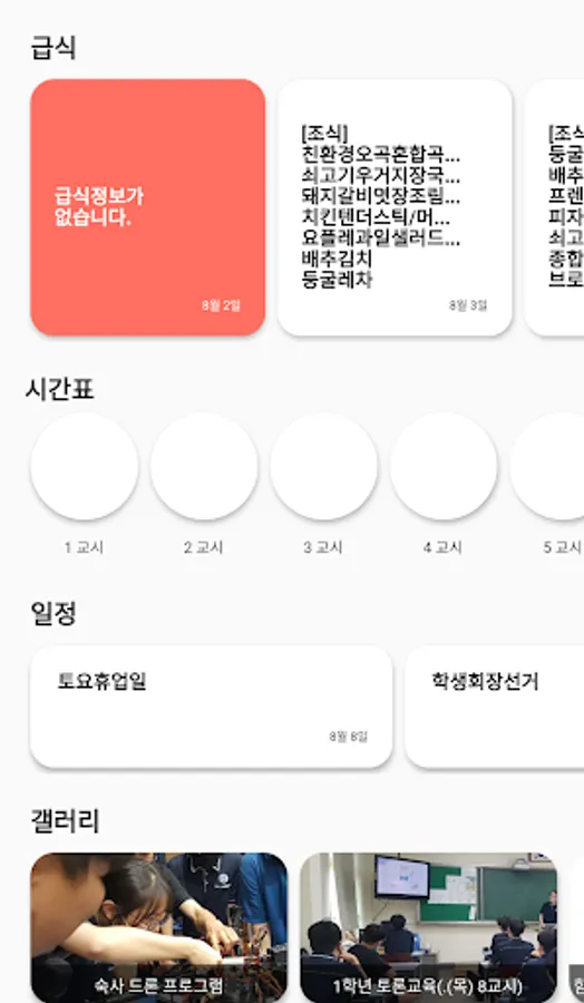 Yeonmu High School does not need to carry meals, timetables, and schedules, and shows meals, timetables, schedules, and galleries easily without having to go directly to the school website and access the gallery. In addition, the downloaded meals, timetables, schedules, and galleries are saved in the mobile phone so that they can be used even in an offline environment.