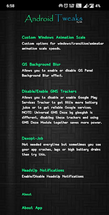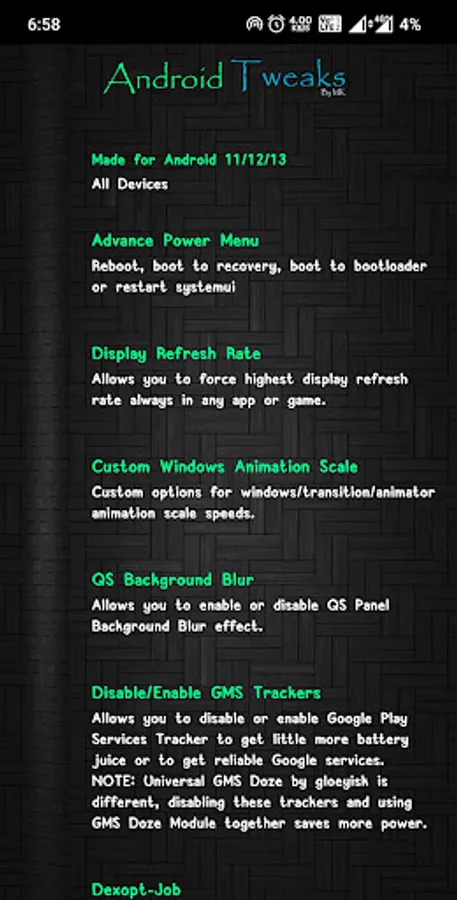 The app for making many useful options available easily in your device to make your Android device more friendly and handy with some shortcuts or say tweaks within one app together.