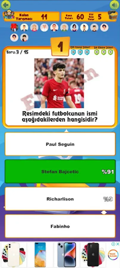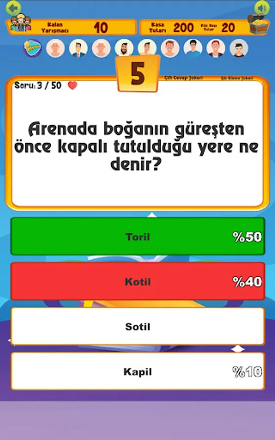The gold required to enter the rooms is covered by your General Gold count. If you have enough General Gold to enter any room, you can start the competition. On the question screen in the competition rooms, all users are asked the same question at the same time. When all users answer or when the question answering time expires, the next question is passed. You have the right to give a maximum of 3 wrong answers in each room. More than 3 wrong answers will be eliminated. If you are eliminated from the room, you will lose the gold you used to enter the room. You cannot answer the questions that will come after you are eliminated in the room, as long as you do not leave the room, you can see the questions and watch the answers of your opponents.