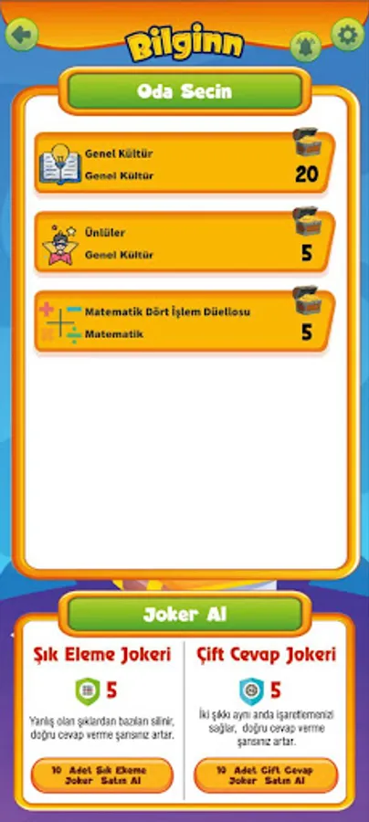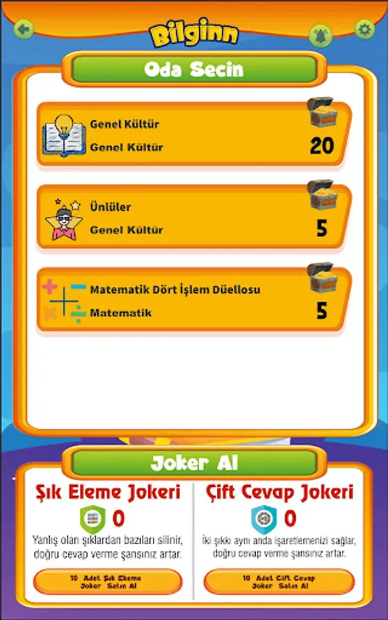 There are 2 types of jokers in the application. (1st Double Answer Joker, 2nd Stylish Elimination Joker) When you first load the game, the system will assign 5 of each joker to your account as a gift. You can use these jokers from the upper right corner of the question screen during the game. If you want to buy new jokers in the future, you can easily buy jokers in the joker management section at the bottom of the room selection screen.