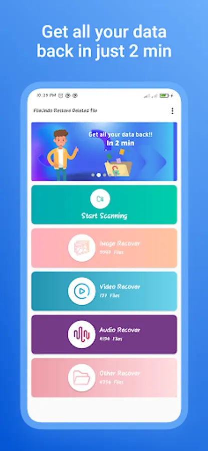 The powerful FileUndo Recover Deleted File tool can help you recover your lost or deleted photos or media file! FileUndo Recovery App is a Super File Recovery tool that easily Scan and recover deleted files(deleted photos and deleted media) and FileUndo recovery app can restore deleted files without root.