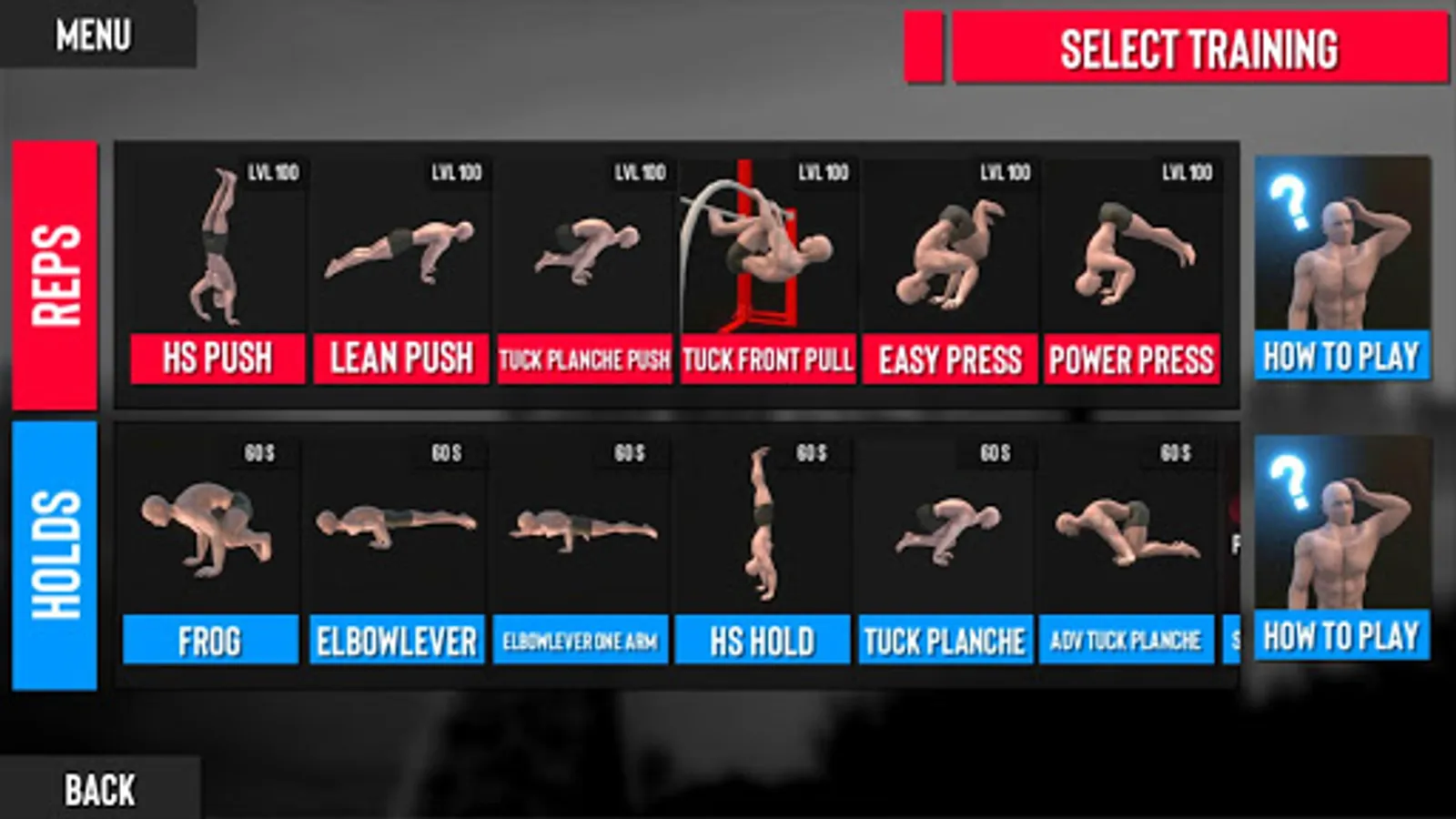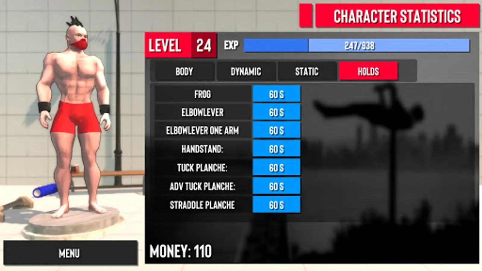 The first stage of the game is to build your figure something like bodybuilding in the next stage in the future version will be learning elements such as handstand, frontlever, backlevel, swing360, swing540, ginger flip and many more.