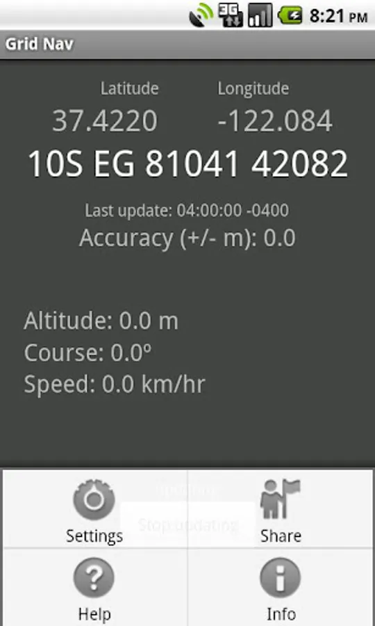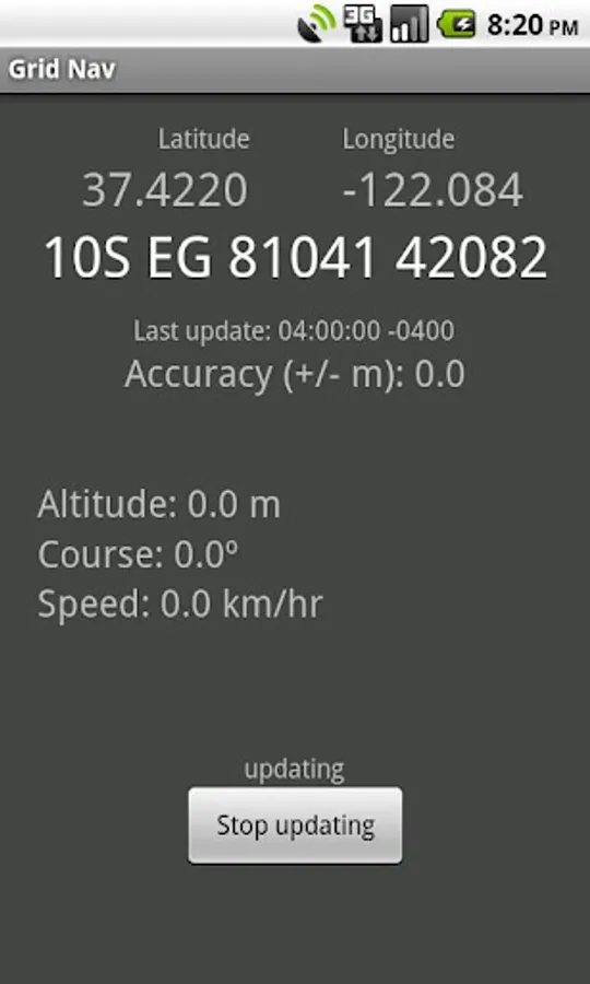 -Displays current location in decimal and MGRS format along with accuracy reading, number of GPS satellites seen, altitude, course and speed.