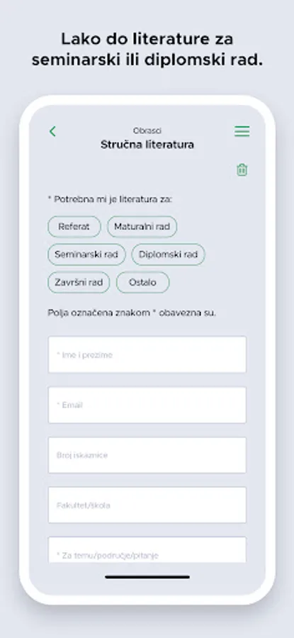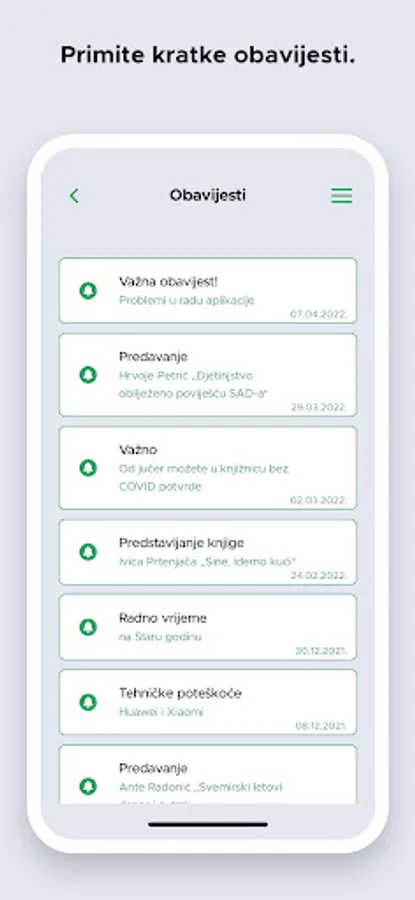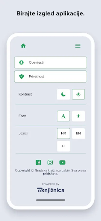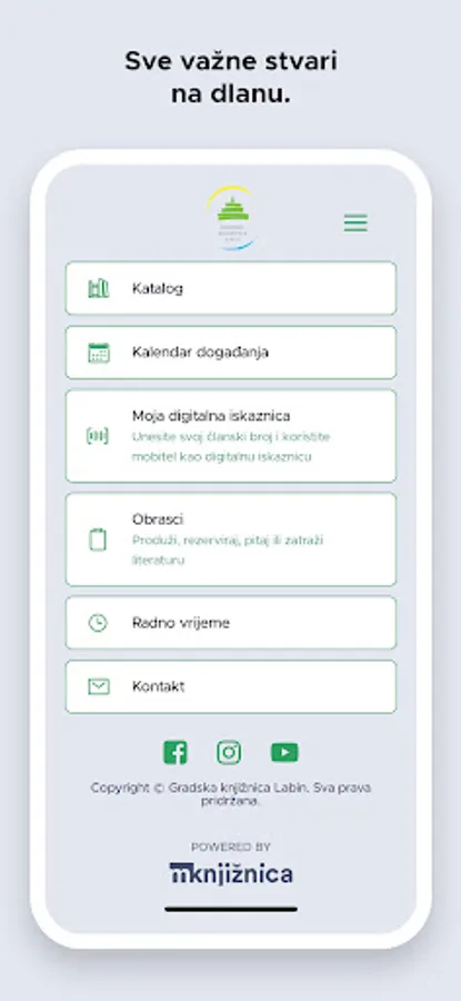 The application is intended for users of the Labin City Library with the help of which users can search the library's e-catalog, view the calendar of events in the library, generate their user number in barcode, extend material lending, reserve material, check whether the library has a copy or request seminar literature. work. The application also contains Library opening hours, library contact information and links to social networks.