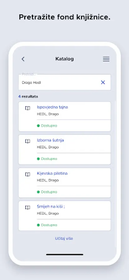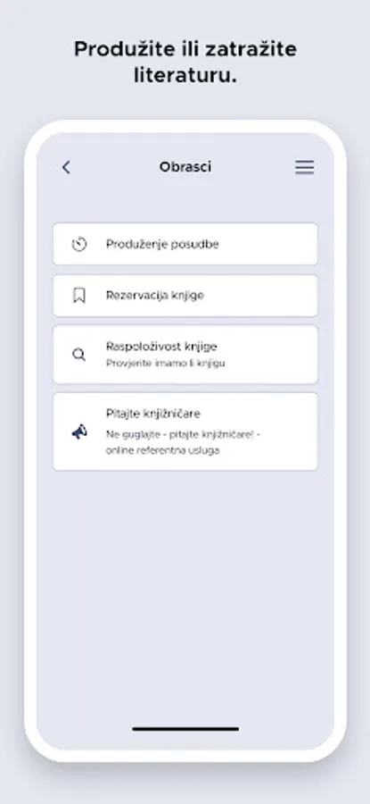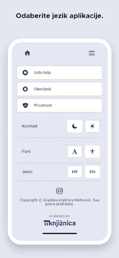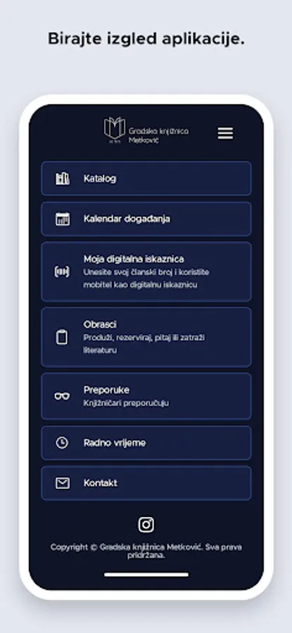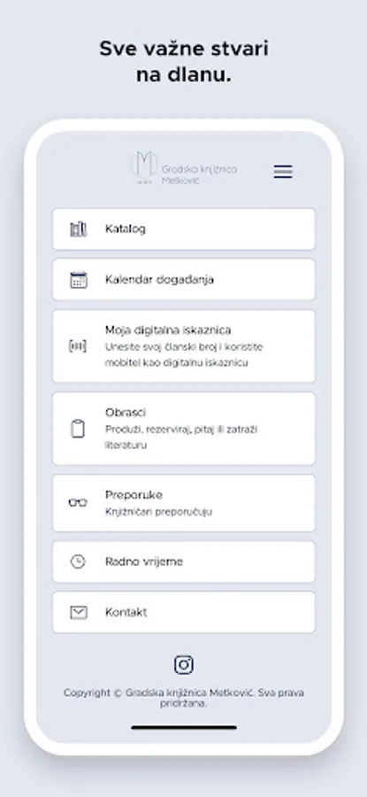 The application is intended for users of the Metković Library, with the help of which users can search the library's e-catalogue, view the calendar of events in the library, generate their user number in a barcode, extend the loan of materials, reserve materials, check whether the library has a copy of a material or request literature for a seminar work. The application includes the library's opening hours, answers to frequently asked questions, contact information of all the library's departments and services, and links to social networks.