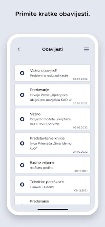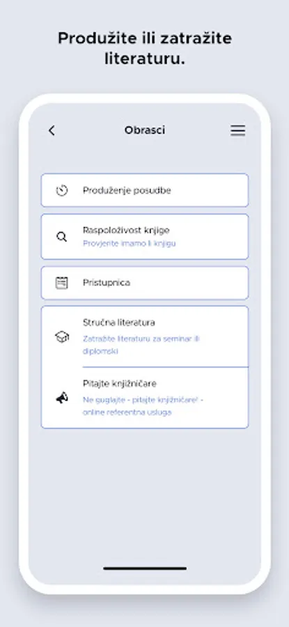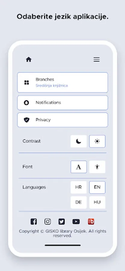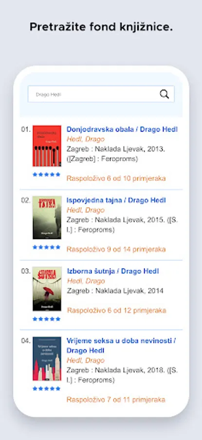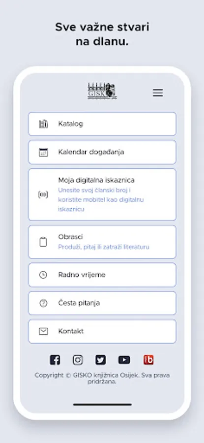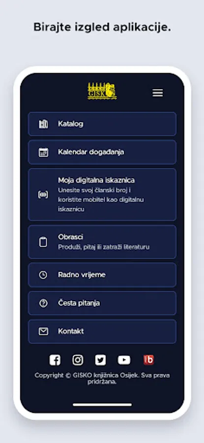 The application is intended for users of the City and University Library of Osijek with the help of which they can search the e-catalog of the library, view the calendar of events in the library, generate their user number in barcode, extend the loan of materials,