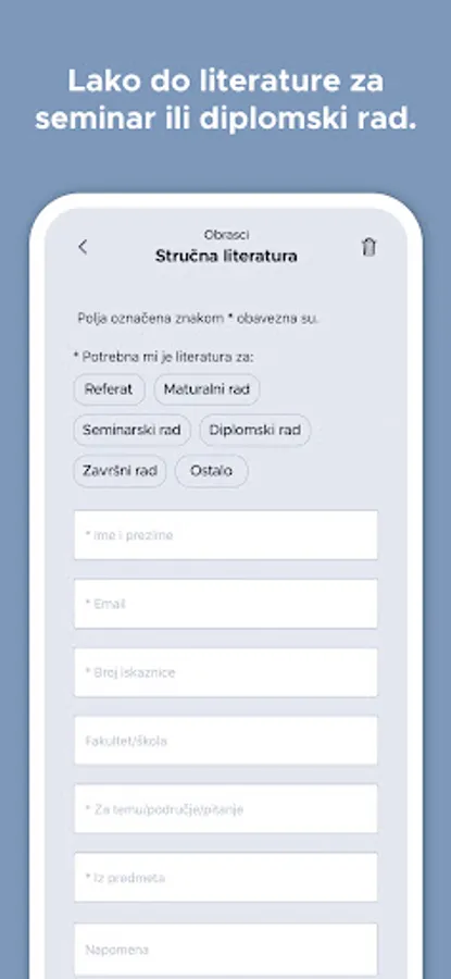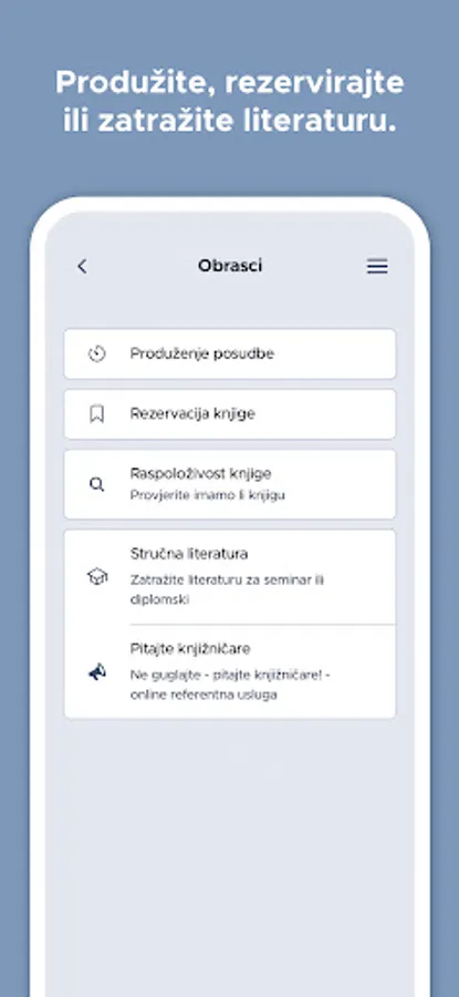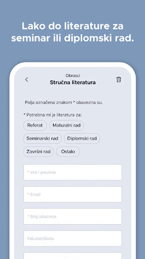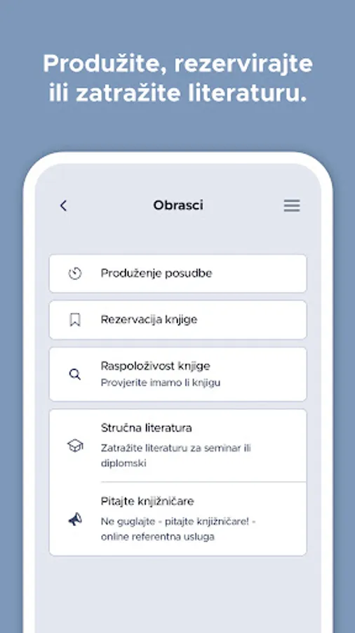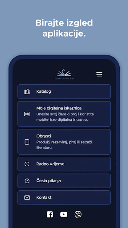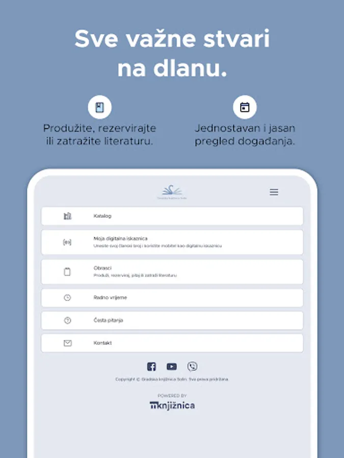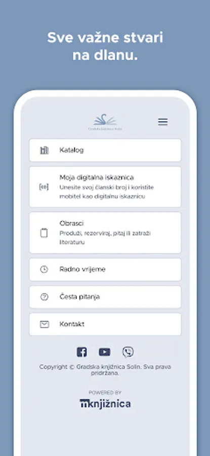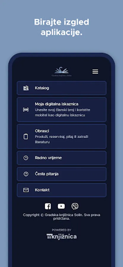 The application is intended for users of the City Library of Solin with the help of which they can search the library's e-catalog, view the calendar of events in the library, generate their user number in barcode, extend the loan period, reserve material, check whether the library has a copy or request literature for seminar work. The application also includes Library opening hours, answers to frequently asked questions, contact details of all branches, departments and services of the library, and links to social networks.
