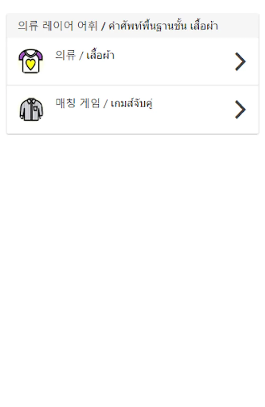 Vocabulary lessons for beginners Advanced learner Adults and children Build a strong vocabulary base in just 10 minutes a day. Design with leading researchers. Learn quickly. Most common Korean vocabulary and sentences for clothing. Matching games Clothing pictures Before your holiday Proven methods for learning stress-free Korean language with more quality audio and video than any other app.