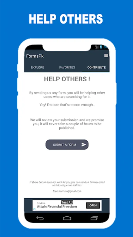 FormsPk app provides functionality to make users to contribute any form they have on their phones by sending us an email.