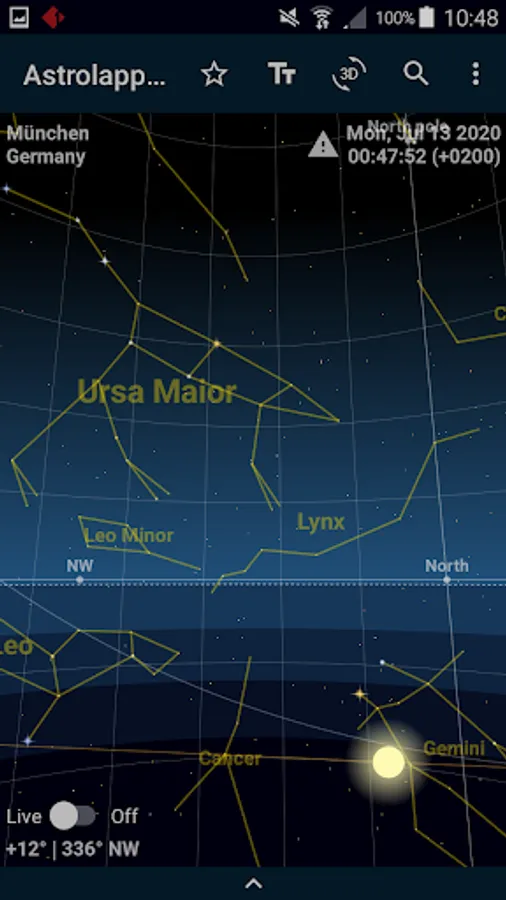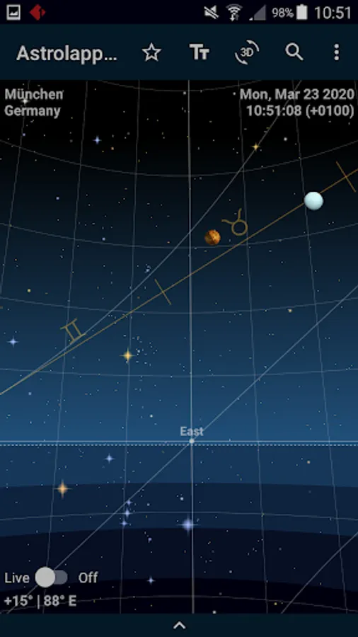As an alternative to live-mode or for devices without a built-in compass, Astrolapp offers a star-map-mode. To switch between the two types of display, tap the '3D'-button. Both modes offer basically the same information and functionality as described above.