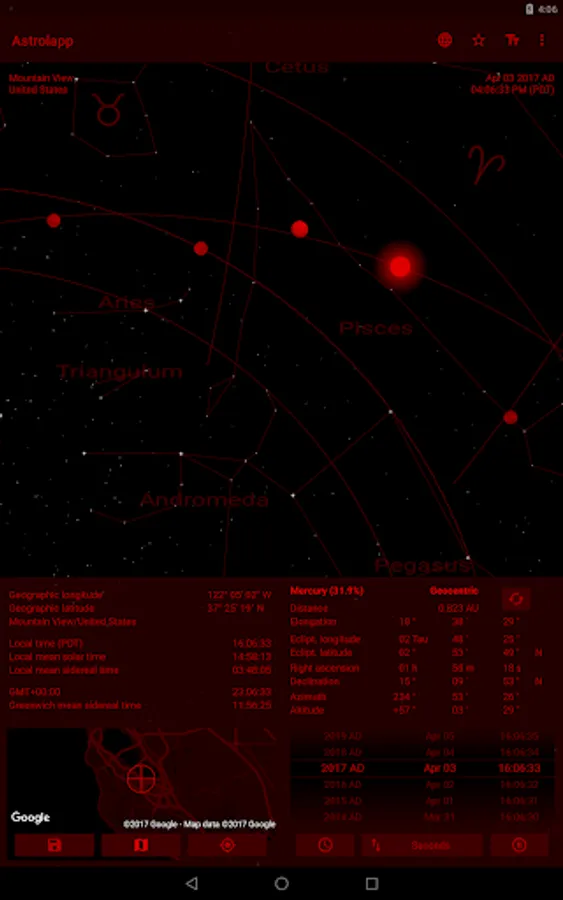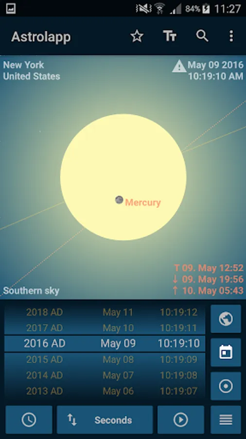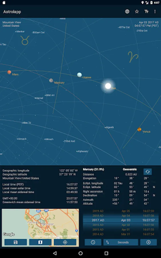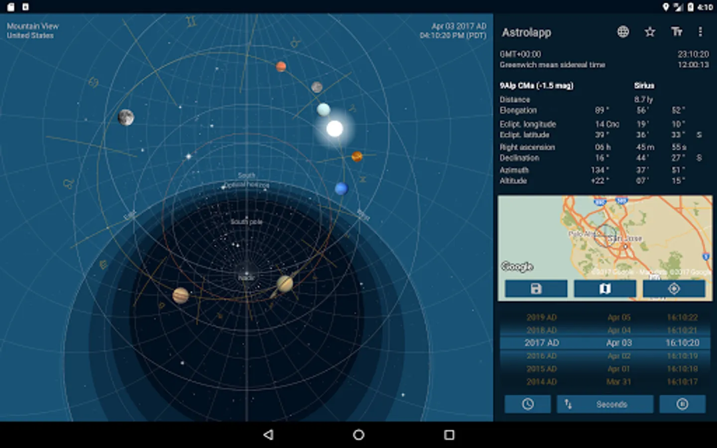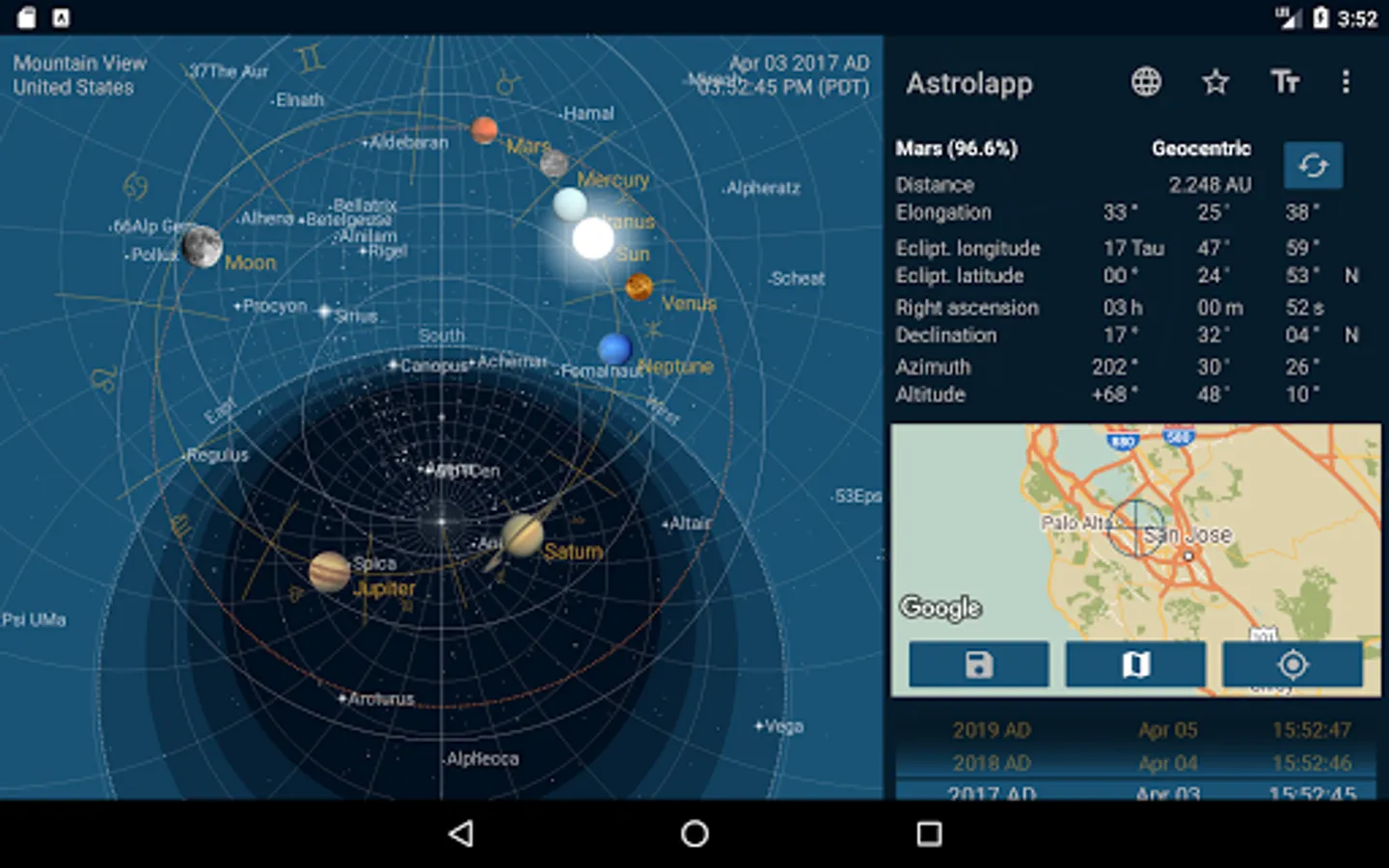 Also, Astrolapp will show you the current sky by default. However, should you be interested in how the sky will look like next month, or wish to plot planetary constellations at historical events decades or centuries ago, Astrolapp will take you there in a few seconds. Watch the sky changing, in fast motion!