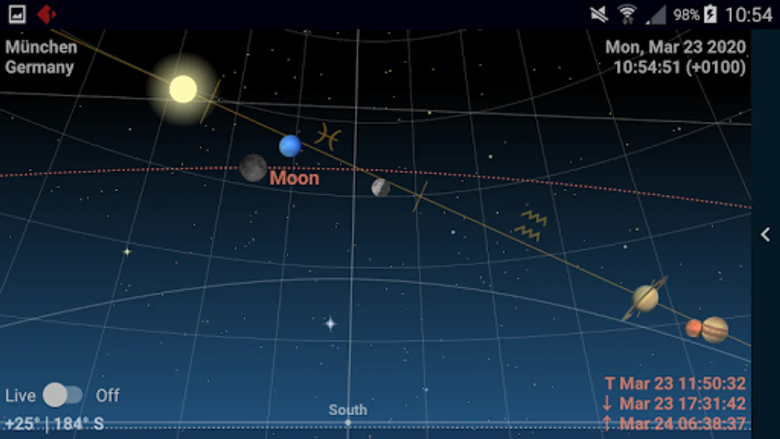 Tapping on any star or planet, Astrolapp highlights the path across the sky which the celestial body follows in the course of the night (or day). In addition, Astrolapp calculates rise and set times for any celestial body to the minute and shows the current position data in tabular form on a separate pull-out display.