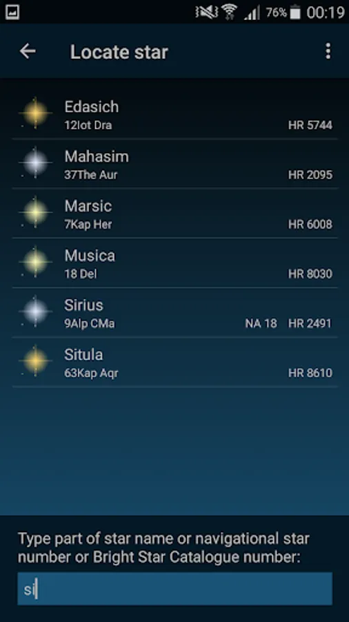 Stars are drawn according to their true color and provided with their names according to the International Astronomical Union. Optionally, the 88 official constellations are drawn with or without name labels. Use a powerful search function and let an arrow guide you to find any planet, star or constellation above your head.