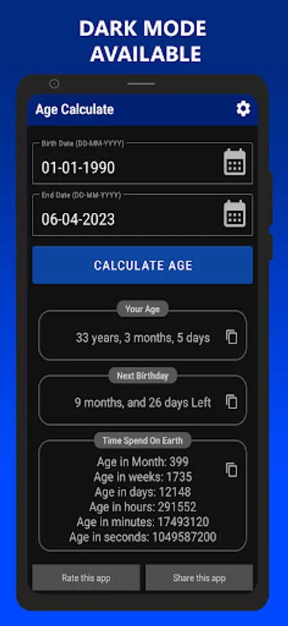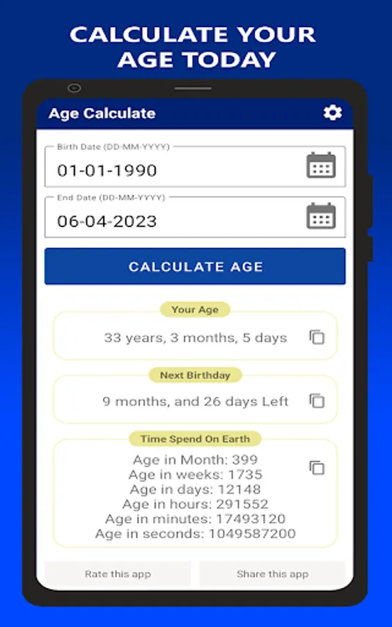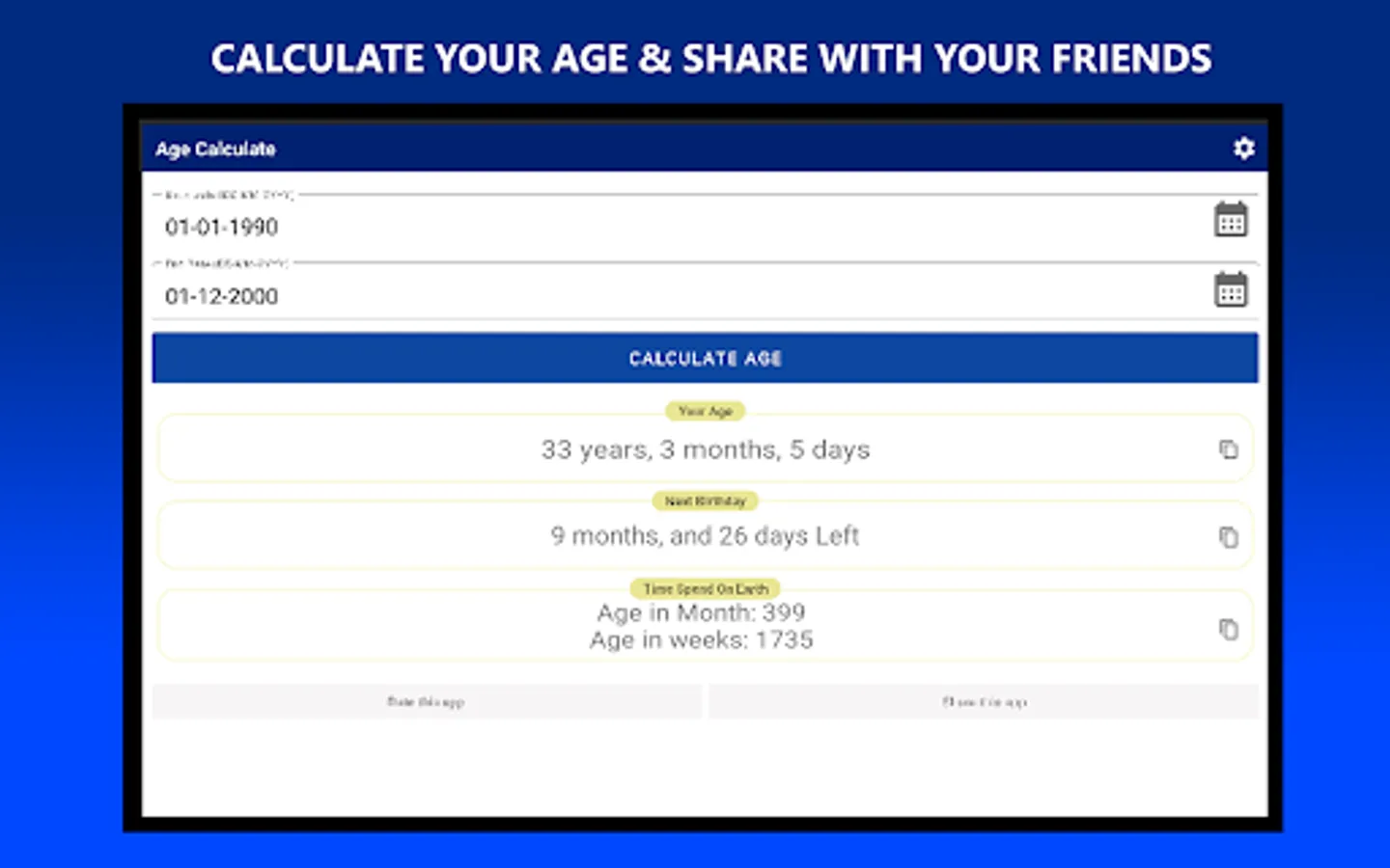 Our app is designed to be easy to use, with a simple and intuitive interface that allows you to quickly and easily calculate your age. Simply enter your date of birth, and our app will do the rest!