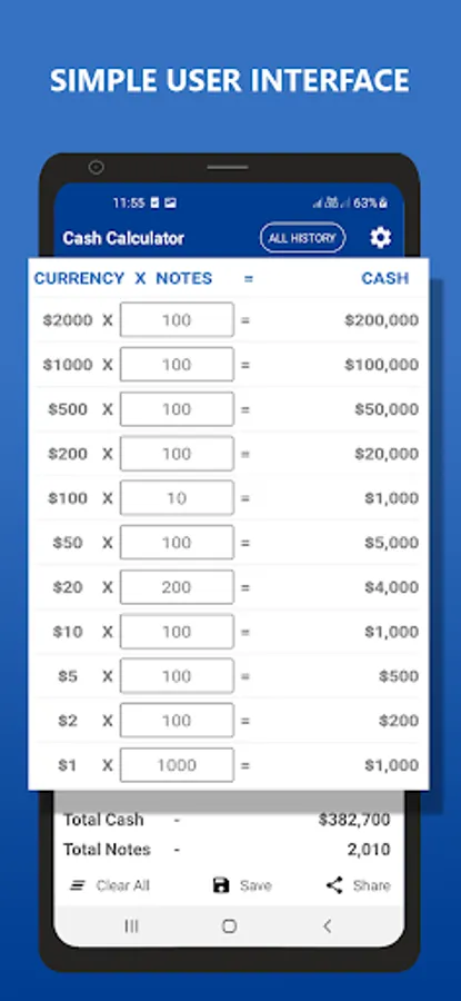 Its use is very simple you can enter number of notes and coins. Cash calculator app will help you to sum total values of notes and coins. The sum of the money entered will be calculated and shown immediately.