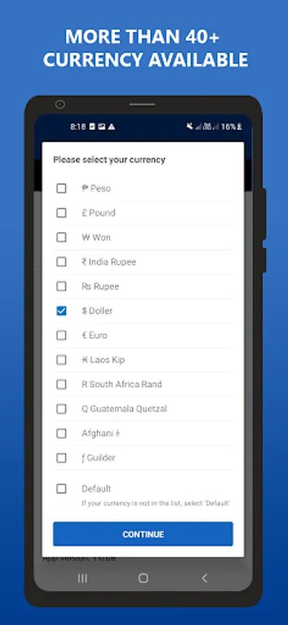 $ Doller, ₹ Indian Rupee, ₨ Rupee, € Euro, ₱ Peso, £ Pound, ﷼ Rial, ₩ Won, ₭ Laos Kip, R South Africa Rand, Q Guatemala Quetzal, ؋ Afghani, ƒ Guilder, ₼ Manat, P Botswana Pula, ៛ Cambodia Riel, ¥ China Yuan Renminbi, ¥ Japan Yen, ₡ Costa Rica Colon, ¢ Ghana Cedi, ₪ Israel Shekel, S Somalia Shilling, ฿ Thailand Baht, ₺ Turkey Lir, ₴ Ukraine Hryvnia, ₫ Viet Nam Dong, ₽ Russia Ruble, ₮ Mongolia Tughrik, ₦ Nigeria Naira, kr Krone, лв Som, KM Marka, kn Croatia Kuna, zł Poland Zloty, Br Belarus Ruble, Gs Paraguay Guarani, Rp Indonesia Rupiah, RM Malaysia Ringgit, MT Mozambique Metical, Bs Venezuela Bolívar, Kč Czech Republic Koruna