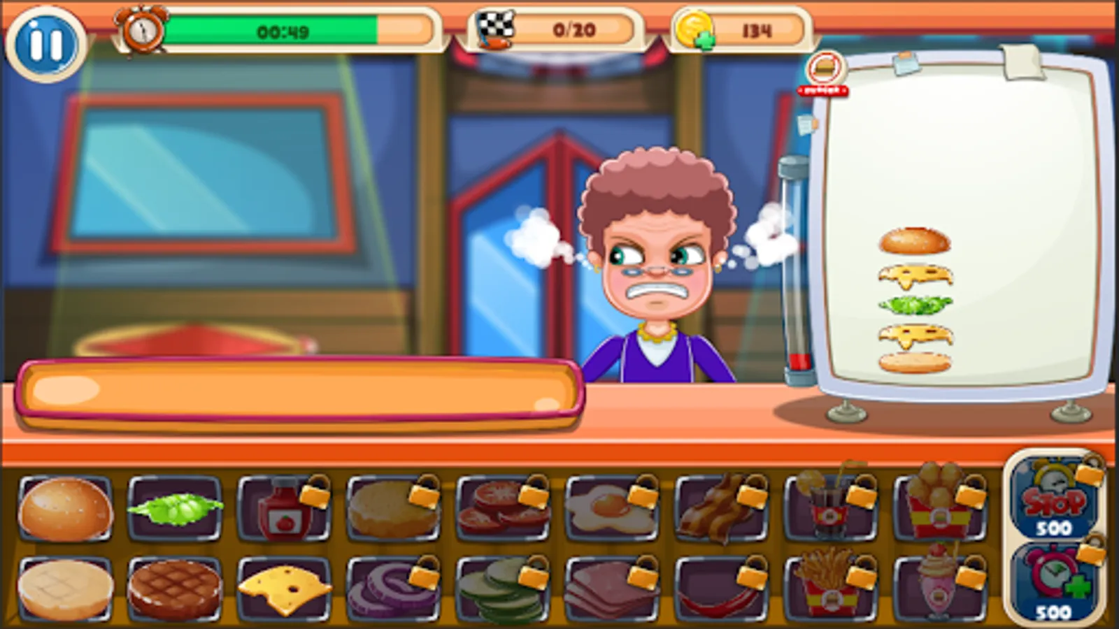 • Many ingredients to choose from, just like in a real burger shop: bread, cheese, crispy burgers, chicken patties, lettuce, onions, pickles, even sausages and much more.