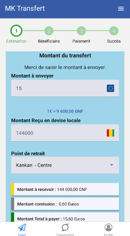 MKtransfert your money transfer solution with unbeatable exchange rates. Take care of your loved ones in Guinea with MKtransfert by taking advantage of the most competitive rates on the market. With MKtransfert, you have the choice of withdrawing your money in Guinean Francs or in foreign currency. All our commissions are clear with no hidden fees.