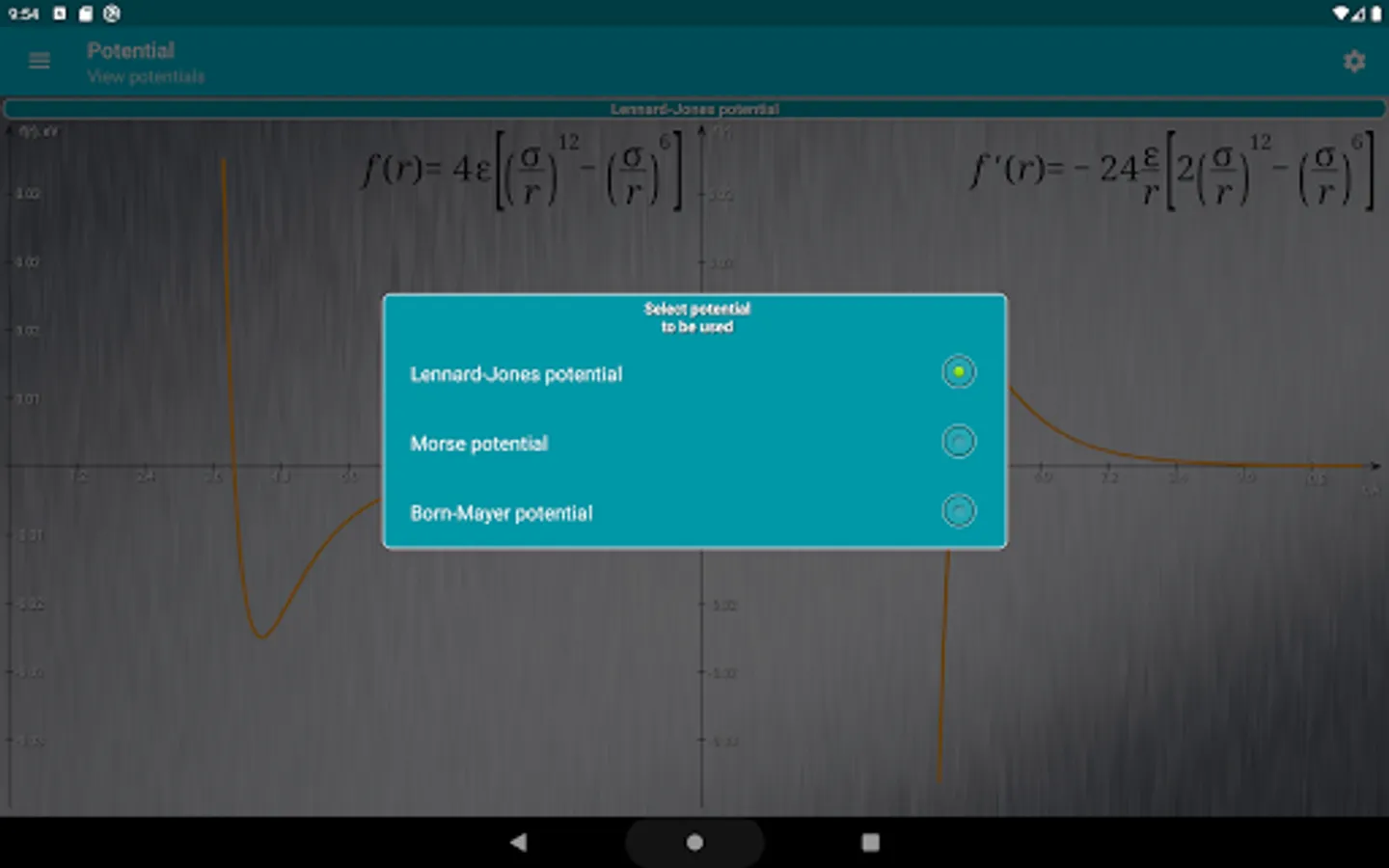 - Possibility to select and visualize selected potential. Currently, three common potentials are available: Lennard-Jones, Morse and Born-Mayer.