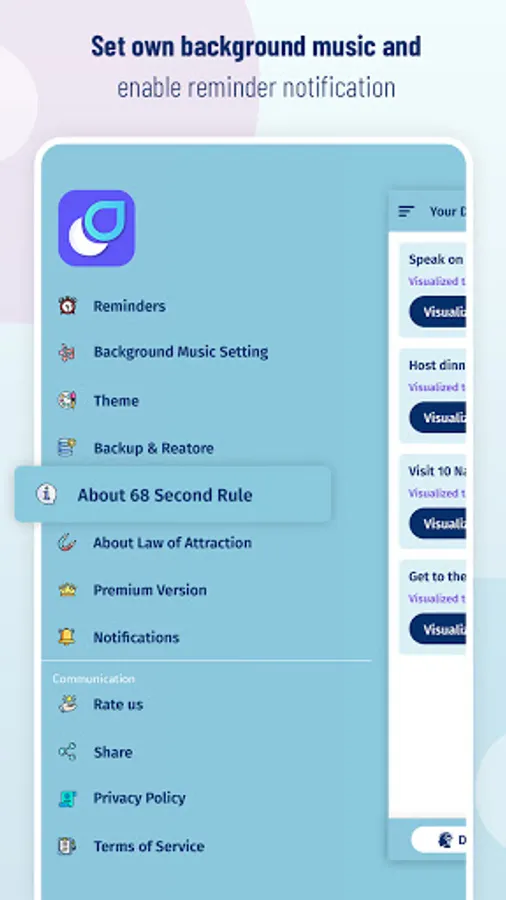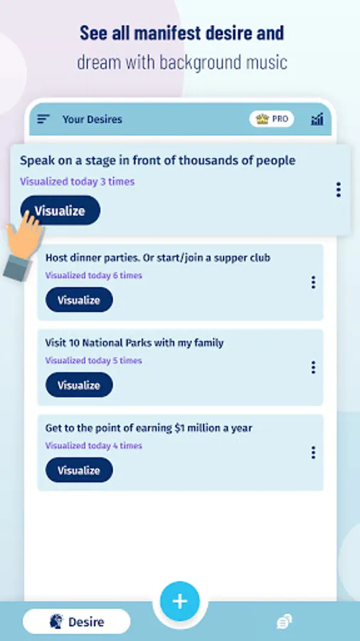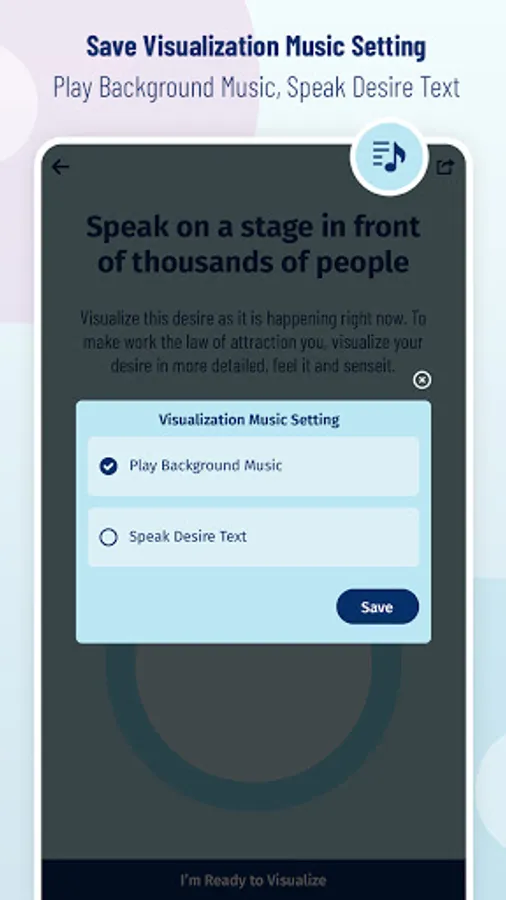 In the app, you can visualize with background music and listen to your desire – according to your preference. Speak desire text – feature is very effective when you want to manifest your affirmation.