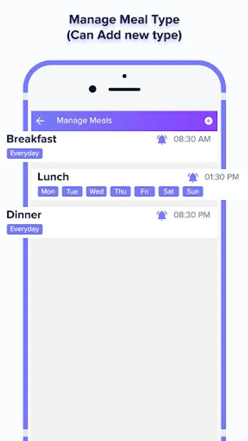 You can add your meal plan schedule like: Breakfast, Lunch, Snacks and dinner. (You can add your own meal types)