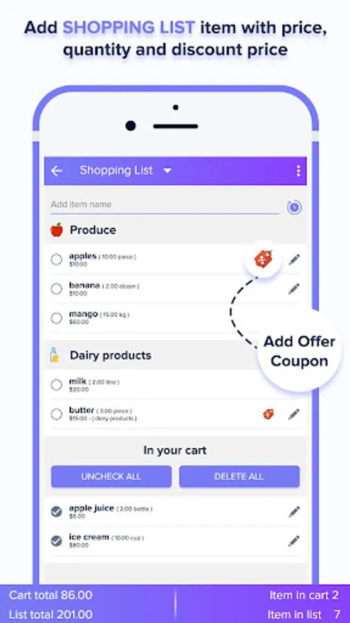 - Shopping list allow to enter discount, quantity with type and item price etc.