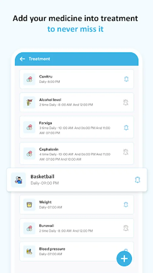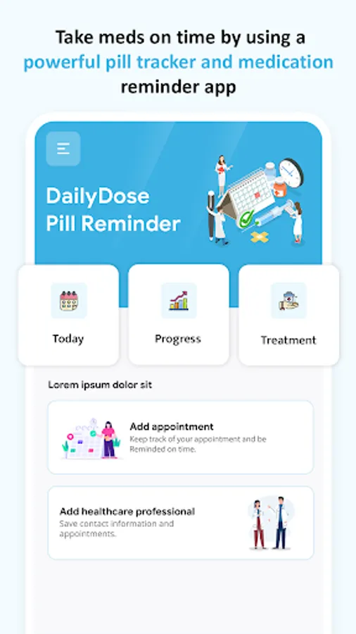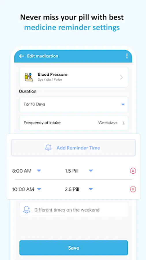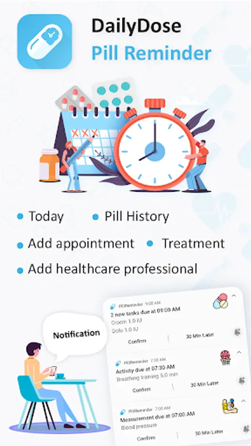 β’ Set the alarm of pill reminders, so you donβt ever forget to take your medication.