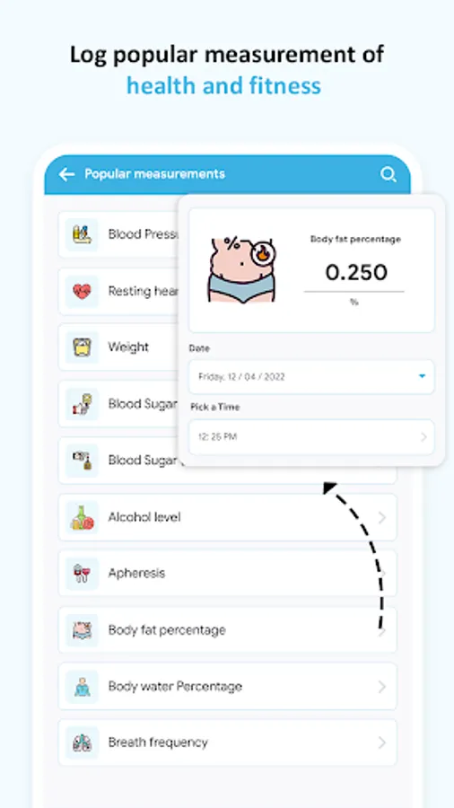 - Track measurements like weight, blood pressure, blood sugar, fat percentage, oxygen saturation, temperature, breathe frequencies