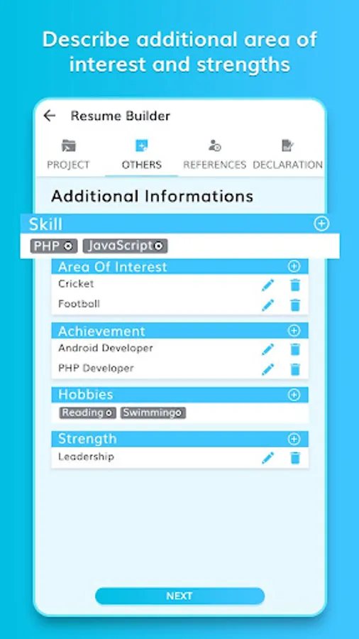 - Skills, Strengths, certifications, Hobbies, Areas of Interest, and Curricular Activities