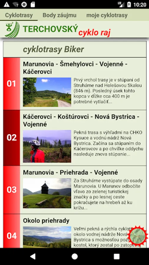 The application downloads various types of objects, that are interesting for cyclists (accommodation and restaurant facilities, water springs, cultural and historical objects...). Optionally, the objects appear on the map.