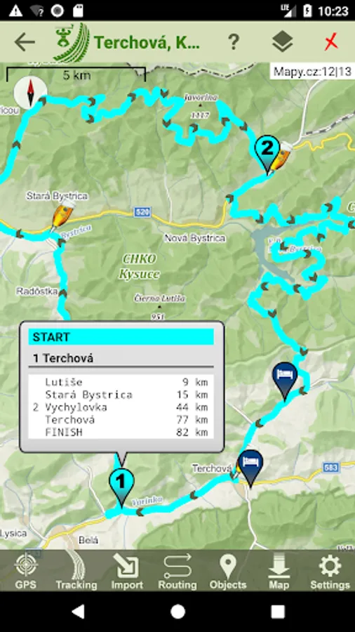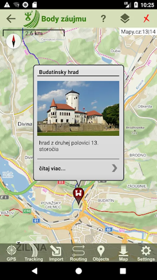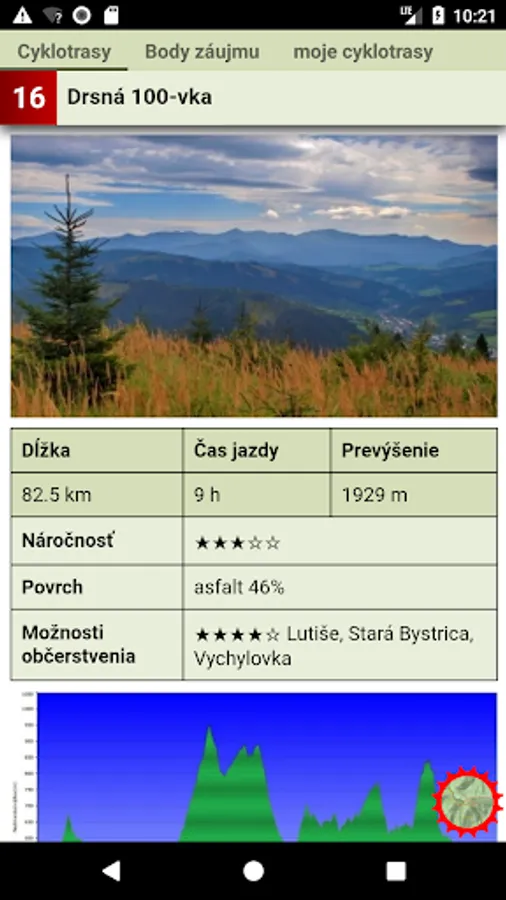 The app contains offline maps of region Terchová, which are independent on internet connection. In addition, several other online maps are available. All maps can be zoomed. Very useful is Magnification function, to adjust the font size for a small screen. Of course, it is possible to orient the map in the direction of travel, or by compass.